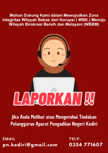Demi mendukung terwujudnya Zona Integritas Wilayah Bebas dari Korupsi (WBK) dan menjadikan Pengadilan Negeri Kediri sebagai Wilayah Birokrasi Bersih dan Melayani (WBBM), apabila Anda menemukan atau melihat tindakan pelanggaran dari aparat kami mohon untuk melaporkan melalui nomor telepon, email serta WhatsApp dibawah ini :