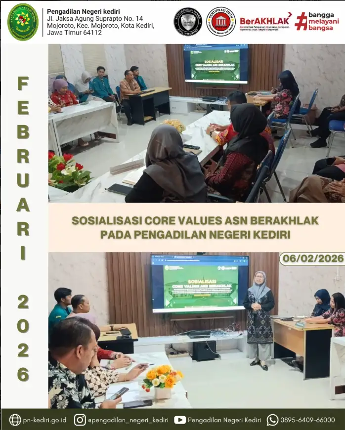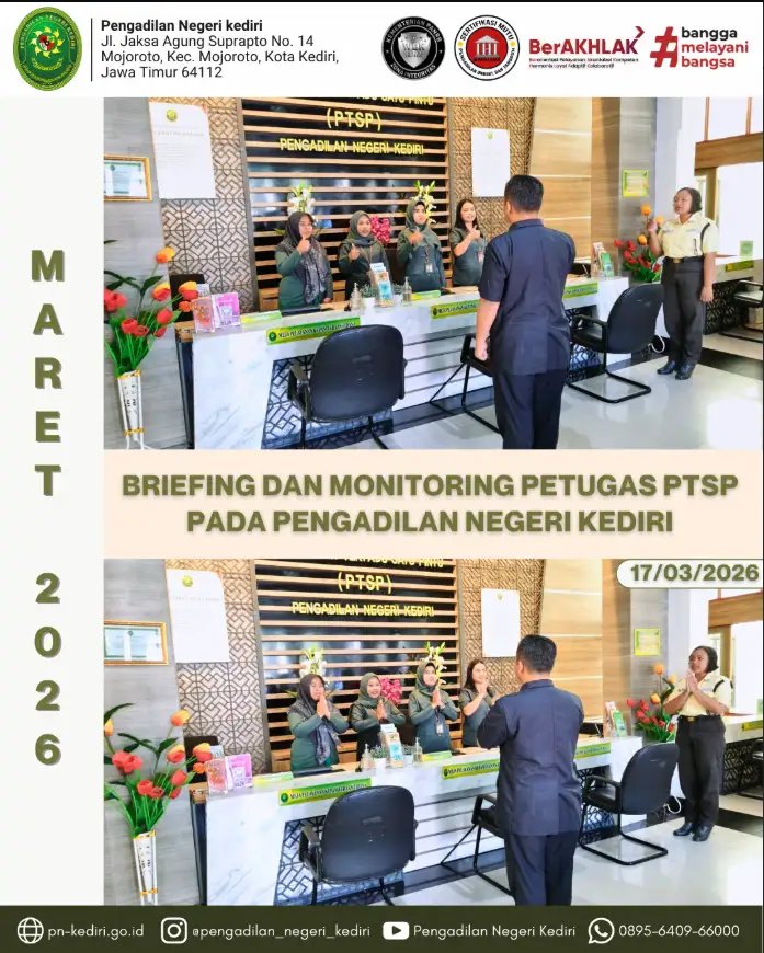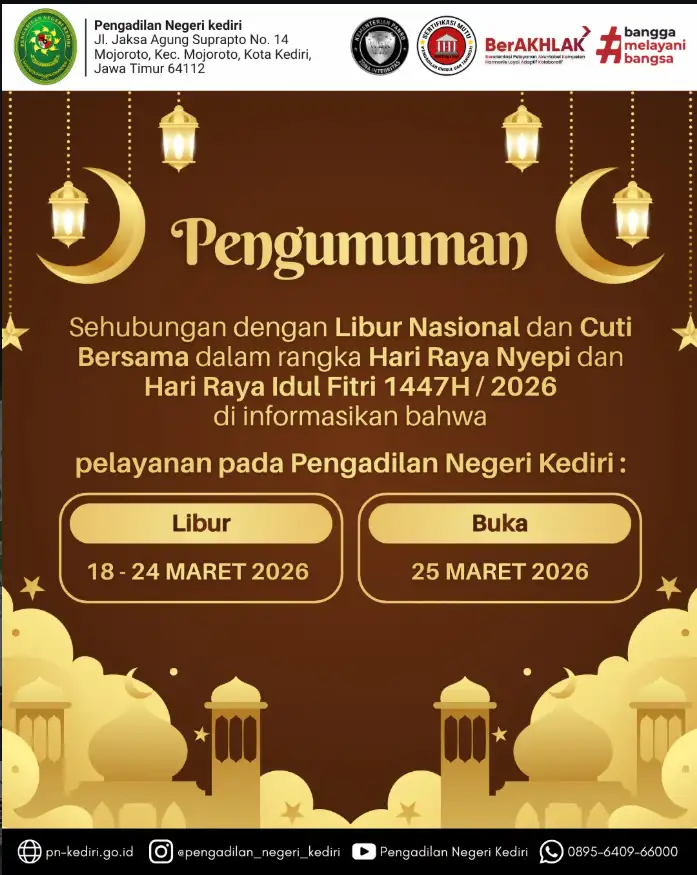 Demi mendukung terwujudnya Zona Integritas Wilayah Bebas dari Korupsi (WBK) dan menjadikan Pengadilan Negeri Kediri sebagai Wilayah Birokrasi Bersih dan Melayani (WBBM), apabila Anda menemukan atau melihat tindakan pelanggaran dari aparat kami mohon untuk melaporkan melalui nomor telepon, email serta WhatsApp dibawah ini :