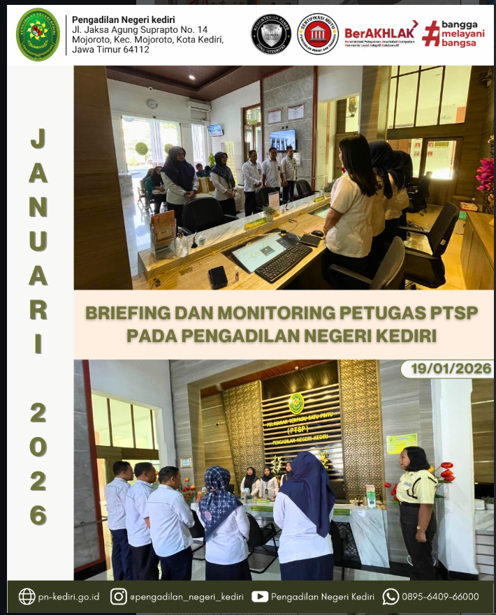 Read MoreKediri, 19 Januari 2026 Pengadilan Negeri Kediri secara rutin melaksanakan kegiatan briefing dan monitoring Petugas Pelayanan Terpadu Satu Pintu (PTSP) sebelum pelaksanaan pelayan sebagai upaya untuk meningkatkan kualitas pelayanan kepada masyarakat pencari keadilan. Kegiatan ini dipimpin oleh Panitera dan Sekretaris, Panitera Muda dan Kepala Sub Bagian Umum dan Keuangan Pengadilan Negeri Kediri serta diikuti oleh…