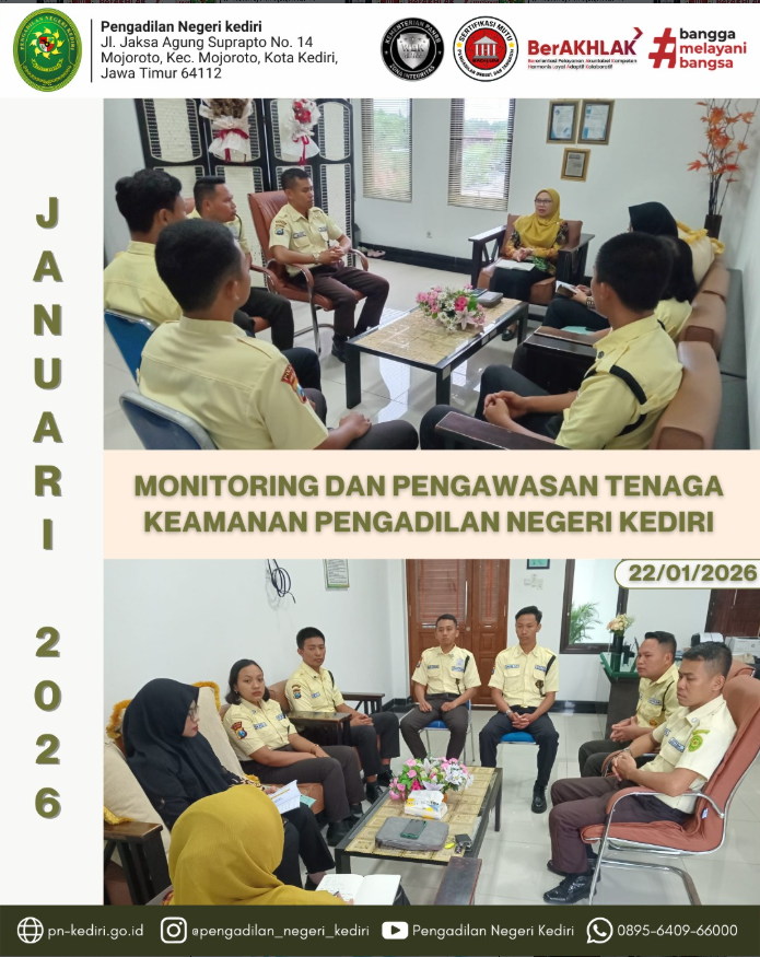 Read More22 Januari 2026 Pengadilan Negeri Kediri melaksanakan kegiatan monitoring dan pengawasan terhadap tenaga keamanan pada Pengadilan Negeri Kediri. Kegiatan tersebut dihadiri oleh Sekretaris Pengadilan Negeri Kediri, Ibu Diana Setyawati, S.E., M.M., serta Kepala Subbagian Umum dan Keuangan Pengadilan Negeri Kediri, Ibu Rina Ariani Rahayu, S.E., dan diikuti oleh seluruh tenaga keamanan Pengadilan Negeri Kediri. Kegiatan…