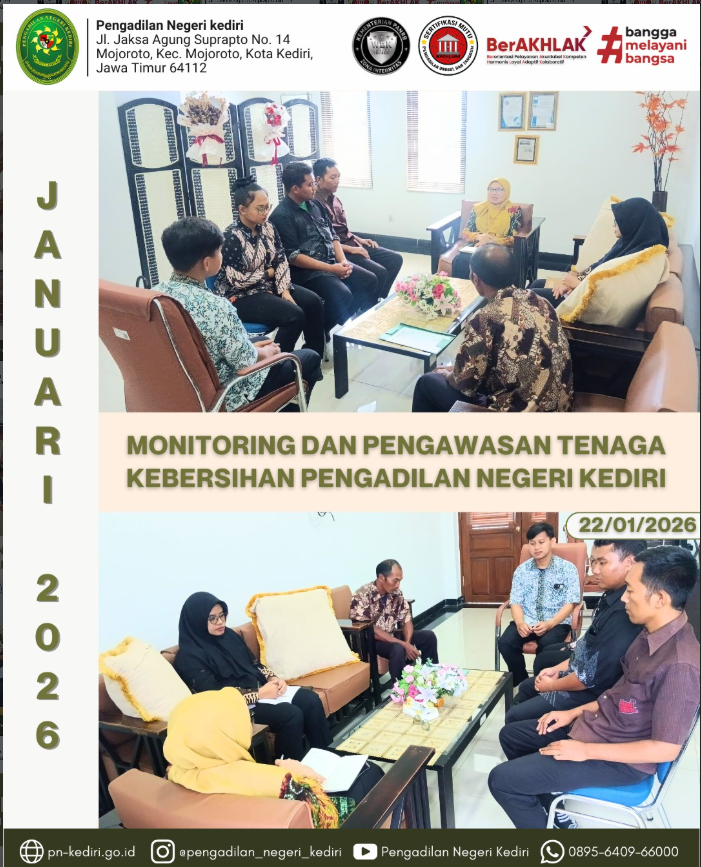 Kediri, 22 Januari 2026 Pengadilan Negeri Kediri melaksanakan kegiatan monitoring dan pengawasan terhadap tenaga kebersihan pada Pengadilan Negeri Kediri. Kegiatan tersebut dihadiri oleh Sekretaris Pengadilan Negeri Kediri, Ibu Diana Setyawati, S.E., M.M., serta Kepala Subbagian Umum dan Keuangan Pengadilan Negeri Kediri, Ibu Rina Ariani Rahayu, S.E., dan diikuti oleh seluruh tenaga kebersihan Pengadilan Negeri Kediri.…