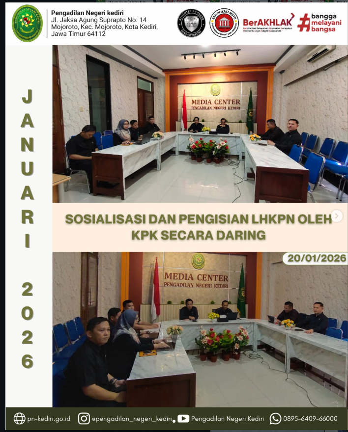 Read MoreKediri, 20 Januari 2026 Sosialisasi dan Pengisian Laporan Harta Kekayaan Penyelenggara Negara (LHKPN) yang diselenggarakan oleh Komisi Pemberantasan Korupsi (KPK) dilaksanakan secara daring dan diikuti oleh jajaran Pengadilan Negeri Kediri. Kegiatan tersebut dihadiri oleh Ketua Pengadilan Negeri Kediri, Bapak Khairul, S.H., M.H., serta Wakil Ketua Pengadilan Negeri Kediri, Bapak Bayu Agung Kurniawan, S.H. Selain pimpinan,…