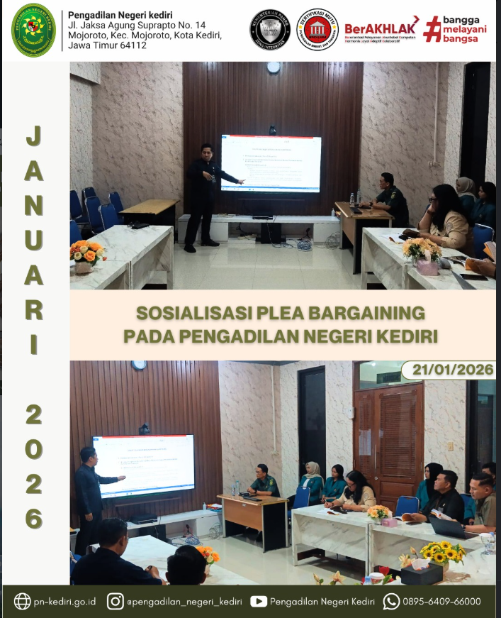 Read MoreKediri, 21 Januari 2026 Pengadilan Negeri Kediri telah menyelenggarakan kegiatan sosialisasi mengenai Plea Bargain yang bertempat di Media Center Pengadilan Negeri Kediri. Kegiatan ini dilaksanakan sebagai bagian dari upaya peningkatan pemahaman aparatur peradilan terhadap konsep dan penerapan Plea Bargain dalam sistem peradilan pidana. Sosialisasi tersebut menghadirkan Ketua Pengadilan Negeri Kediri, Bapak Khairul, S.H., M.H., sebagai…