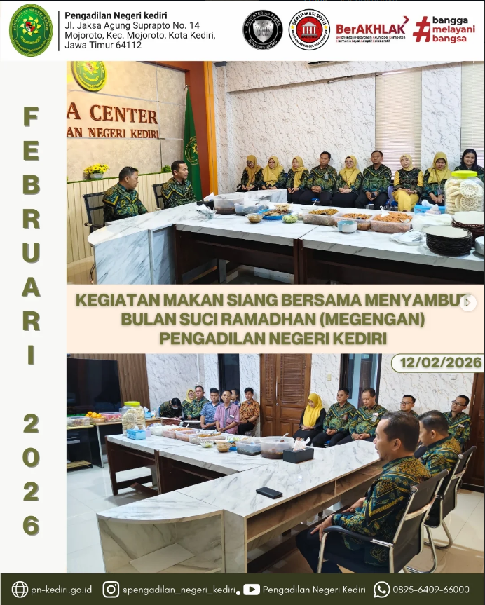Read MoreKediri, 12 Februari 2026 Kegiatan makan siang bersama dalam rangka menyambut Bulan Suci Ramadhan (Megengan) dilaksanakan oleh Pengadilan Negeri Kediri dengan penuh khidmat dan suasana kekeluargaan. Kegiatan tersebut dipimpin oleh Wakil Ketua Pengadilan Negeri Kediri dan diikuti oleh seluruh keluarga besar Pengadilan Negeri Kediri. Acara ini diselenggarakan sebagai bentuk kebersamaan sekaligus sarana mempererat tali silaturahmi…