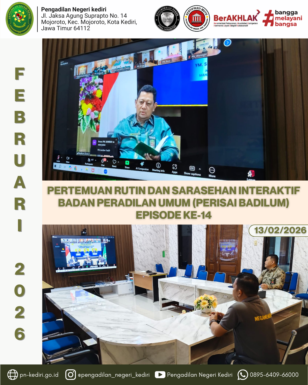 Kediri, 13 Februari 2026 Pengadilan Negeri Kediri mengikuti Acara Pertemuan Rutin dan Sarasehan Interaktif Badan Peradilan Umum (Perisai Badilum) Episode ke-14 secara daring pada Hari Jumat, tanggal 13 Februari 2026, bertempat di Ruang Media Center Pengadilan Negeri Kediri. Kegiatan ini dalam rangka mendorong kultur berdiskusi dan berpikir kritis ilmiah para Hakim dan Tenaga Teknis di…
