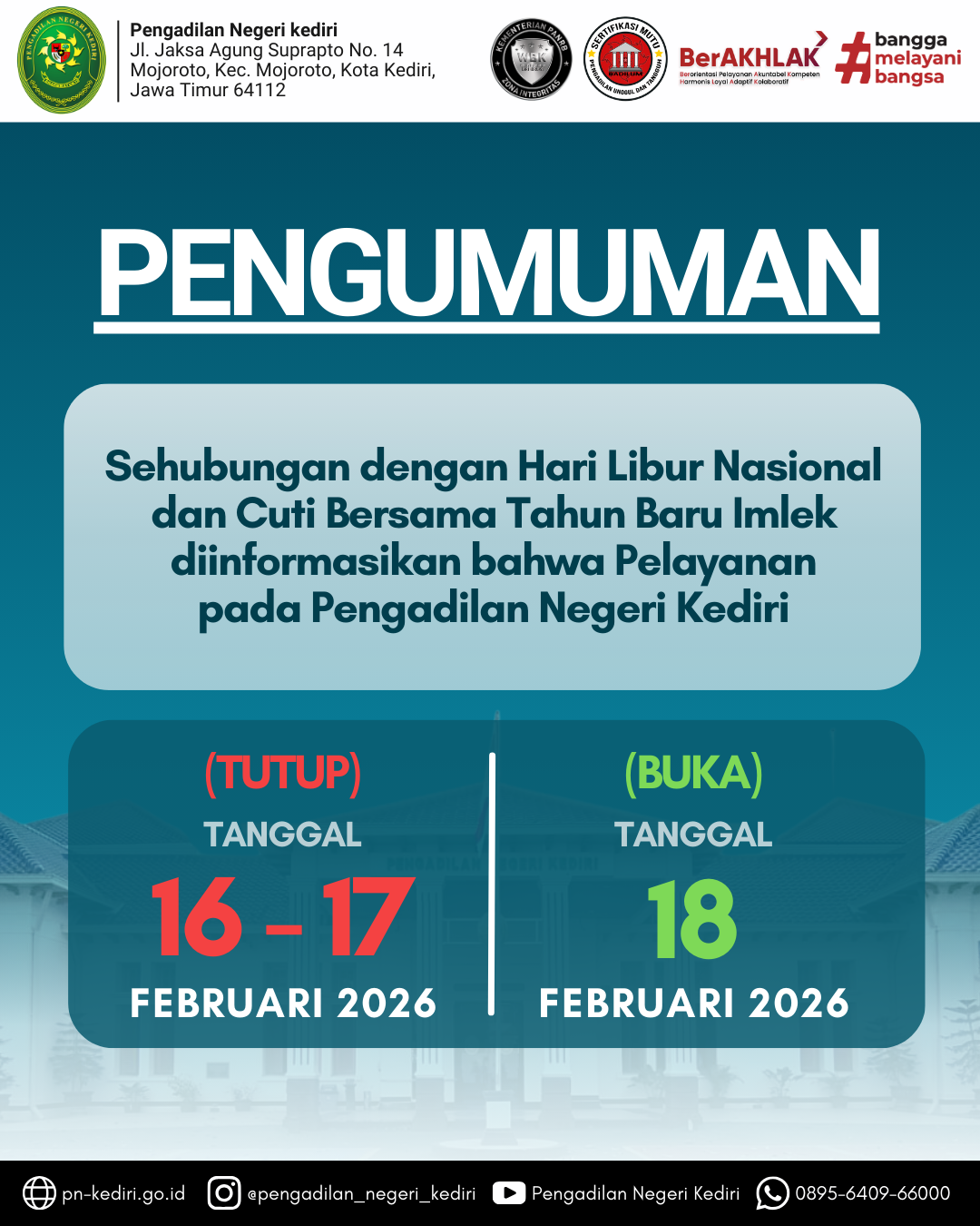 Read MoreSehubungan dengan Hari Libur Nasional dan Cuti Bersama Tahun Baru Imlek diinformasikan bahwa Pelayananpada Pengadilan Negeri Kediri Kantor Pengadilan Negeri KediriTutup pada tanggal : 16 sampai 17 Februari 2026dan Buka pada tanggal : 18 Februari 2026. @humasmahkamahagung @ditjenbadilum @kemenpanrb @rbkunwas pnkediriprima #humasmahkamahagung #ditjenbadilum #kemenpanrb #rbkunwas Views: 0