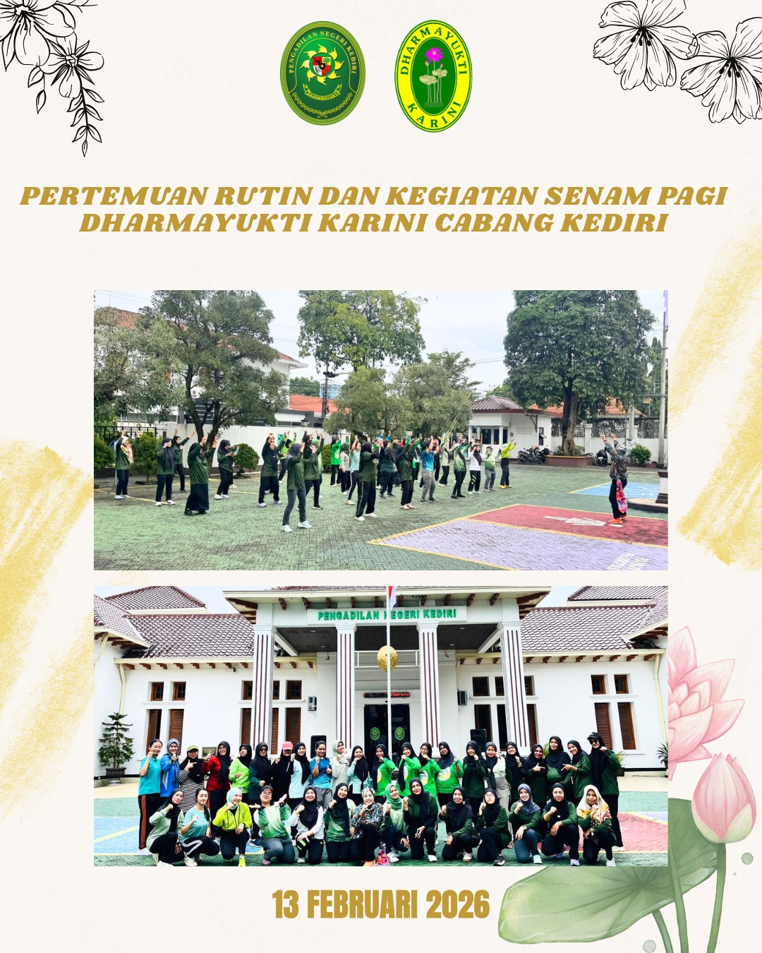 Read MoreDalam rangka mempererat tali silaturahmi dan meningkatkan kesehatan jasmani, Dharmayukti Karini Cabang Kediri melaksanakan kegiatan pertemuan rutin yang dirangkaikan dengan senam pagi bersama. Kegiatan tersebut berlangsung dengan penuh semangat dan kebersamaan, diikuti oleh seluruh anggota Dharmayukti Karini Cabang Kediri (DYK Pengadilan Negeri Kediri dan Pengadilan Agama Kota Kediri) Kegiatan diawali dengan senam pagi bersama yang…