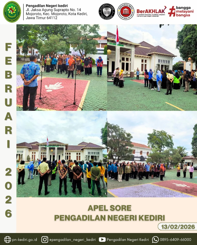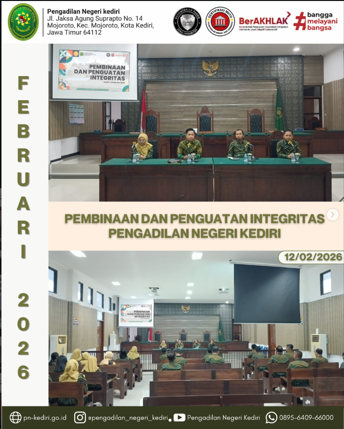 Read MoreKediri, 12 Februari 2026 Pengadilan Negeri Kediri melaksanakan kegiatan Pembinaan dan Penguatan Integritas yang bertempat di Ruang Sidang Cakra Pengadilan Negeri Kediri. Kegiatan ini dipimpin langsung oleh Ketua Pengadilan Negeri Kediri dan diikuti oleh para Hakim, ASN, serta PPPK Pengadilan Negeri Kediri. Dalam pengarahannya, Ketua Pengadilan Negeri Kediri menyampaikan hasil pembinaan Yang Mulia Ketua Mahkamah…