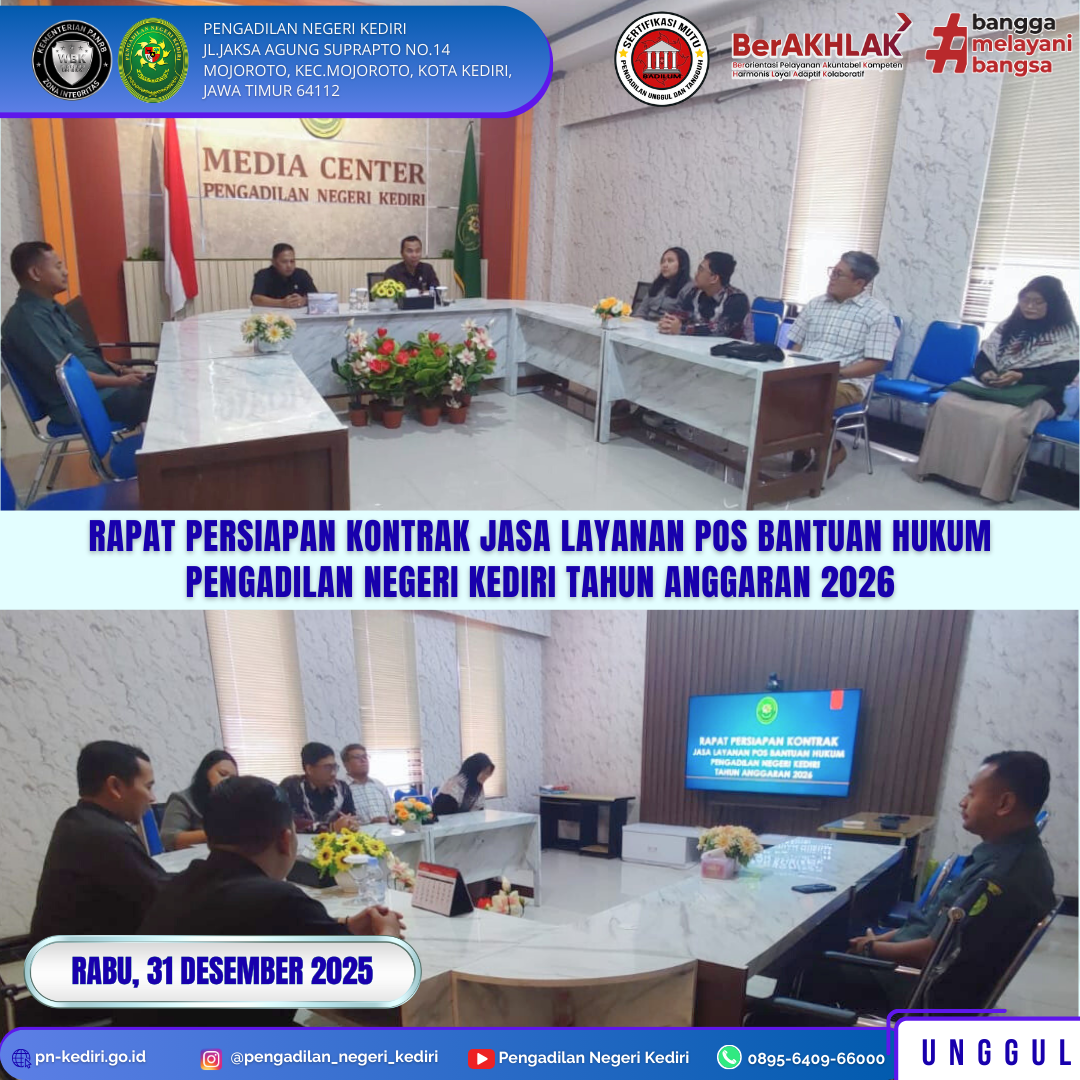 Read MoreKediri, 31 Desember 2025 Dalam rangka memastikan terselenggaranya layanan bantuan hukum yang optimal bagi masyarakat pencari keadilan, Pengadilan Negeri Kediri melaksanakan Rapat Persiapan Kontrak Jasa Layanan Pos Bantuan Hukum (Posbakum) Tahun Anggaran 2026, bertempat di Ruang Media Center Pengadilan Negeri Kediri pada Hari Rabu, tanggal 31 Desember 2025. Rapat dipimpin oleh Wakil Ketua Pengadilan Negeri…