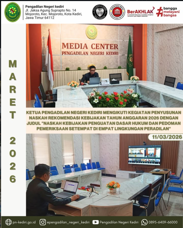 Read MoreKediri, 11 Maret 2026 Ketua Pengadilan Negeri Kediri mengikuti Kegiatan Penyusunan Naskah Rekomendasi Kebijakan Tahun Anggaran 2026 dengan judul “Naskah Kebijakan Penguatan Dasar Hukum dan Pedoman Pemeriksaan Setempat di Empat Lingkungan Peradilan” yang dilaksanakan secara virtual melalui Zoom Meeting pada Rabu, 11 Maret 2026. Kegiatan ini diikuti dari Media Center Pengadilan Negeri Kediri dan dihadiri…