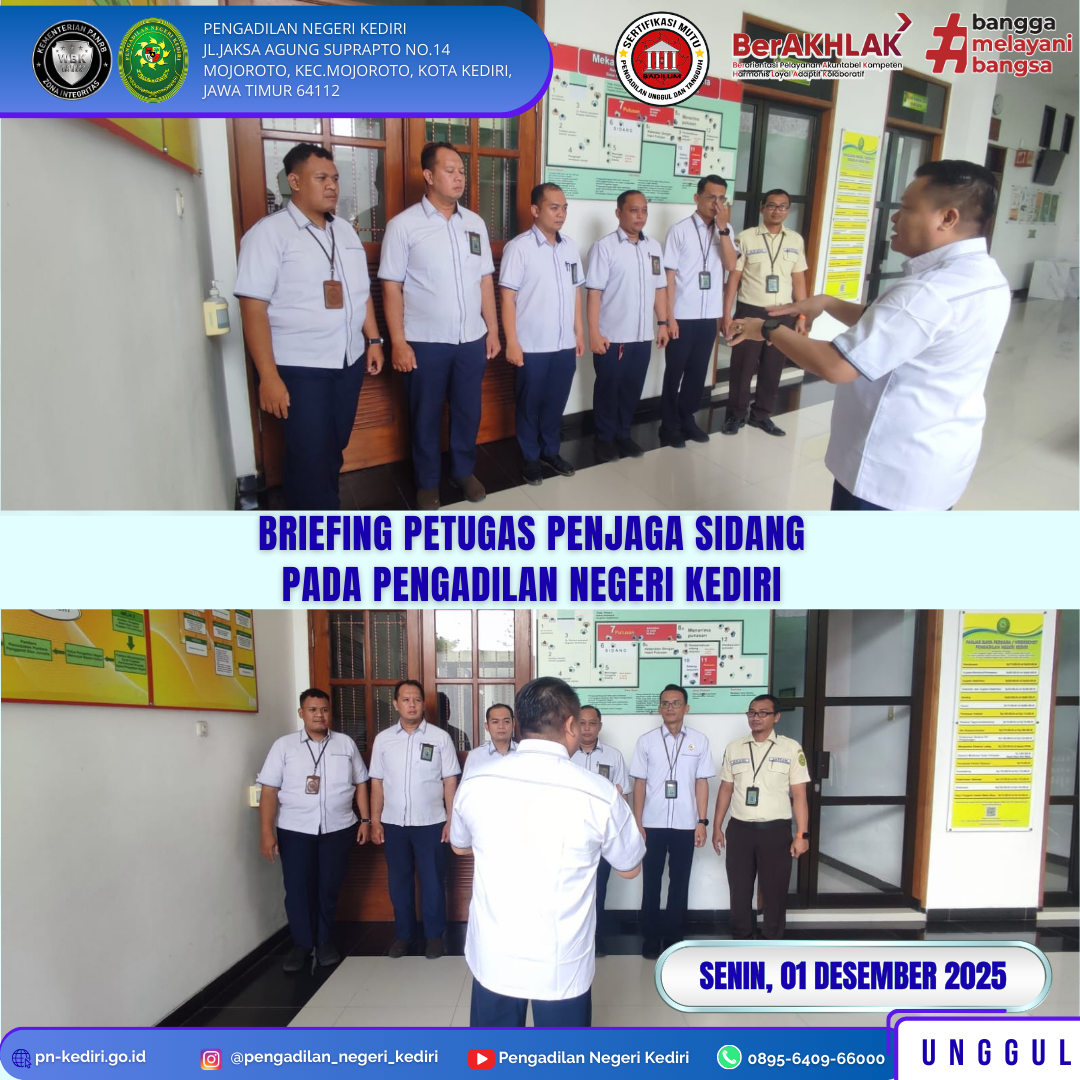 Pengadilan Negeri Kediri melaksanakan Briefing Petugas Penjaga Sidang pada pagi hari Senin, tanggal 01 Desember 2025 sebelum pelaksanaan agenda persidangan. Kegiatan ini dipimpin oleh Panitera Pengadilan Negeri Kediri, Bapak Berly, S.E., S.H., dengan tujuan memastikan seluruh petugas memahami tugas, prosedur, serta standar operasional dalam menjaga ketertiban dan keamanan jalannya sidang.