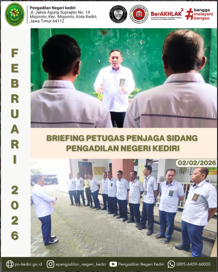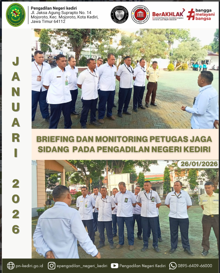 Read MoreKediri, 26 Januari 2026 Pengadilan Negeri Kediri melaksanakan kegiatan briefing dan monitoring petugas penjaga sidang sebagai bagian dari upaya peningkatan kesiapsiagaan, disiplin, dan kualitas pelayanan persidangan. Kegiatan ini diikuti oleh petugas penjaga sidang dan dipimpin Paniter Pengadilan Negeri Kediri, Bapak Imam Mualimin, S.H., M.H. Dalam briefing tersebut disampaikan arahan terkait tugas dan tanggung jawab petugas…