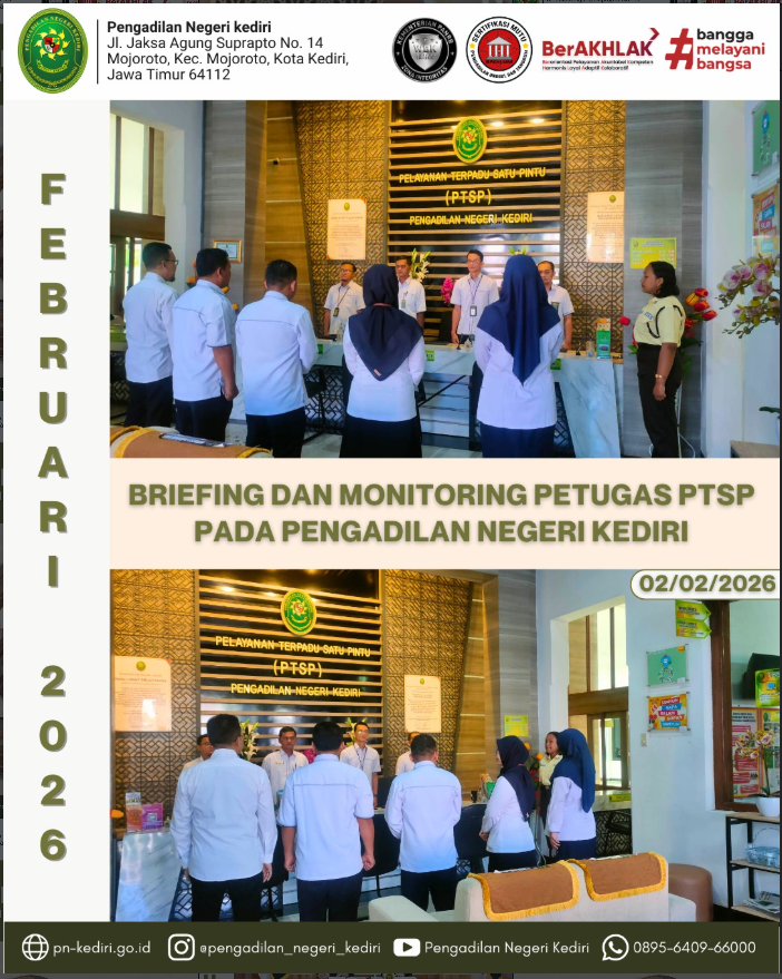 Read MoreKediri, 02 Februari 2026 Pengadilan Negeri Kediri secara rutin melaksanakan kegiatan Briefing dan Monitoring Petugas Pelayanan Terpadu Satu Pintu (PTSP) sebagai upaya peningkatan kualitas pelayanan publik dan penegakan standar pelayanan prima. Kegiatan ini dilaksanakan sebelum jam operasional pelayanan dimulai dan dipimpin oleh Panitera Muda Perdata, Bapak Galih Thoso Wibawanto, S.E., S.H.. Turut juga dihadiri oleh…