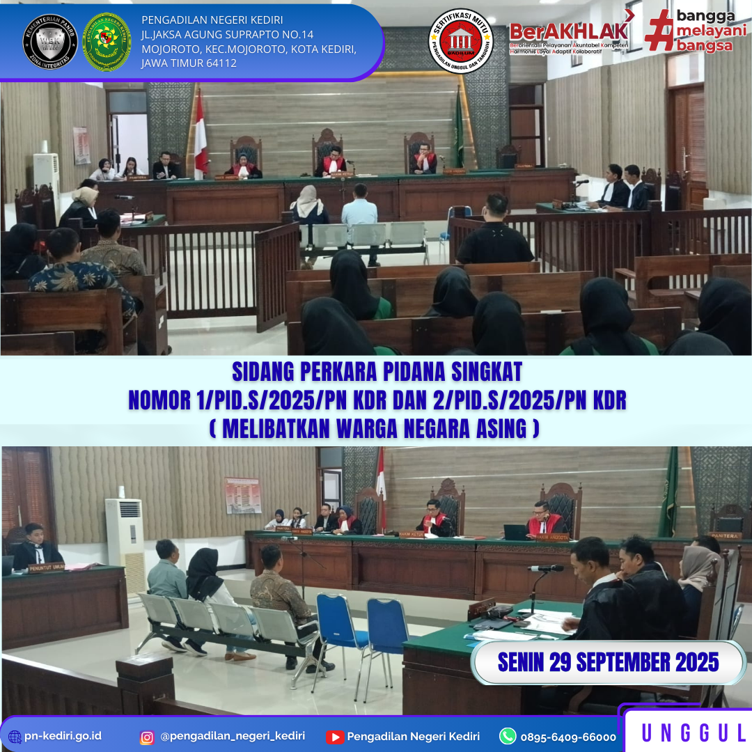 Read MorePada hari Senin, tanggal 29 September 2025 pukul 13.00 Wib, di ruang sidang Cakra. Majelis Hakim yang diketuai Khairul dengan hakim anggota Novi Nuradhayanty dan Damar Kusuma Wardana serta Panitera Pengganti Galih Thoso Wibowo menyidangkan perkara dengan acara singkat perkara pidana nomor 1/Pid S/2025/PN Kdr atas nama Terdakwa W dan perkara pidana nomor 2/Pid S/2025/PN…