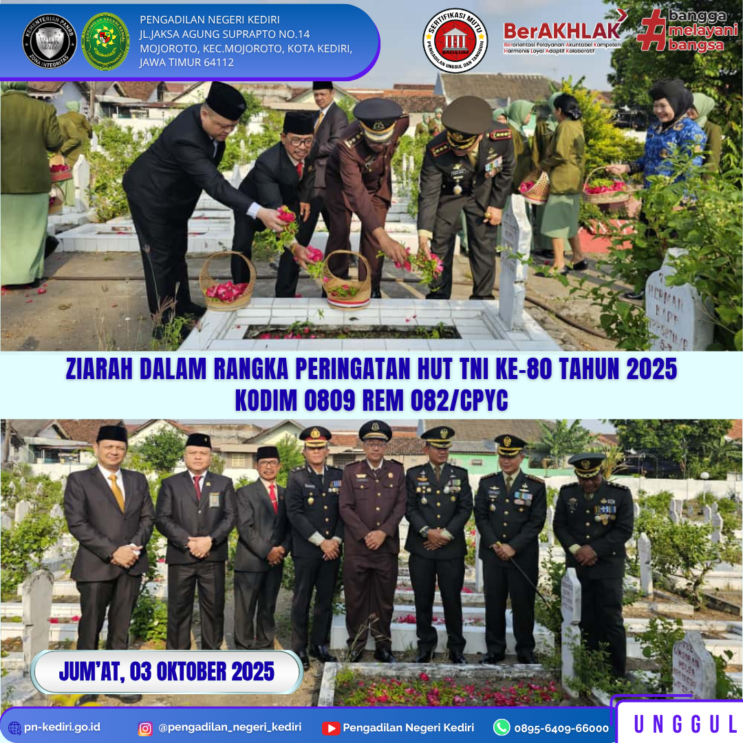 Read MoreKediri, 03 Oktober 2025 Panitera Pengadilan Negeri Kediri, Bapak Berly, S.E., S.H. mewakili Ketua Pengadilan Negeri Kediri megikuti kegiatan Ziarah dalam rangka Peringatan HUT TNI ke-80 Tahun 2025, Kodim 0809 Rem 082/CPYC pada Hari Jum’at, tanggal 03 Oktober 2025, bertempat di Taman Makam Pahlawan Joyoboyo Kota Kediri. @humasmahkamahagung@ditjenbadilum@kemenpanrb@rbkunwas #pnkediriprima#humasmahkamahagung#ditjenbadilum#kemenpanrb#rbkunwas Views: 0