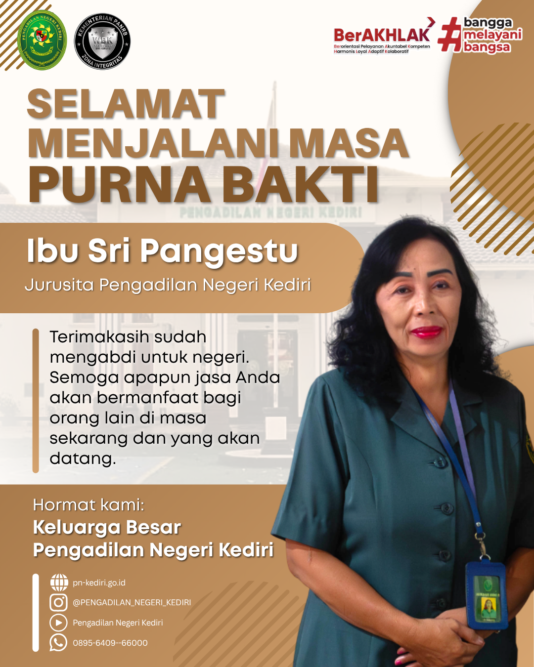 Keluarga Besar Pengadilan Negeri Kediri Mengucapkan : Selamat Menjalani Masa Purnabakti Ibu Sri Pangestu Jurusita Pengadilan Negeri Kediri Terimakasih sudah mengabdi untuk negeri, Semoga apapun jasa anda akan bermanfaat bagi orang lain di masa sekarang dan yang akan datang @humasmahkamahagung@ditjenbadilum@kemenpanrb@rbkunwas #pnkediriprima#humasmahkamahagung#ditjenbadilum#kemenpanrb#rbkunwas Views: 2