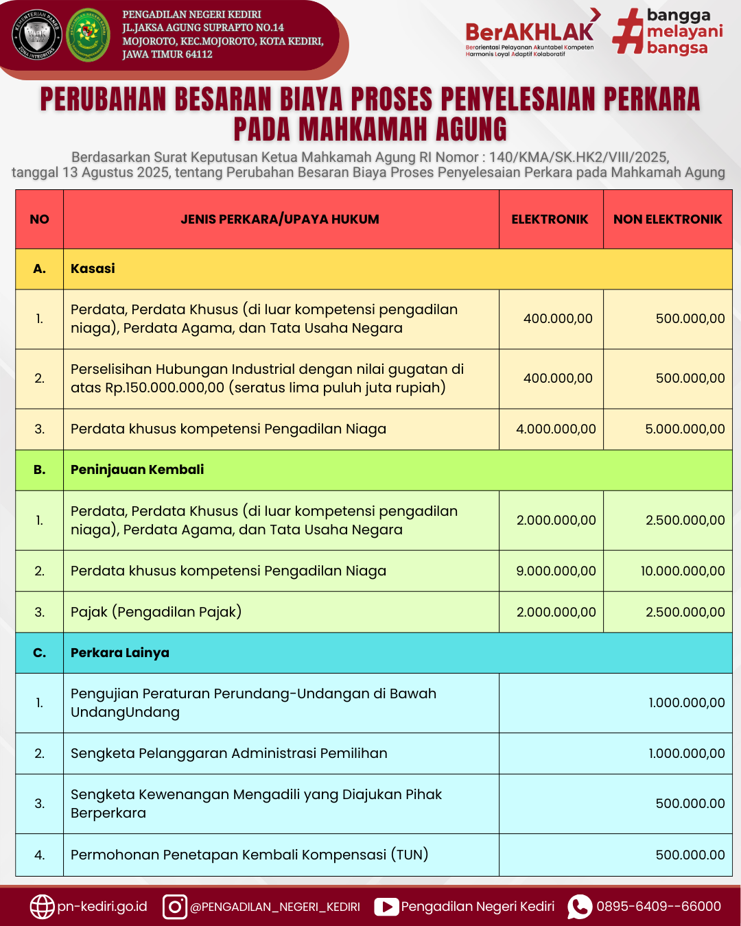 Read MoreSurat Keputusan Ketua Mahkamah Agung RI Nomor : 140/KMA/SK.HK2/VIII/2025,tanggal 13 Agustus 2025, tentang Perubahan Besaran Biaya Proses Penyelesaian Perkara pada Mahkamah Agung. Keputusan ini berlaku efektif mulai tanggal 1 September 2025 sebagai langkah untuk menyesuaikan kebutuhan penyelesaian perkara yang lebih efektif dan transparan. @humasmahkamahagung@ditjenbadilum@kemenpanrb@rbkunwas #pnkediriprima#humasmahkamahagung#ditjenbadilum#kemenpanrb#rbkunwas Views: 283