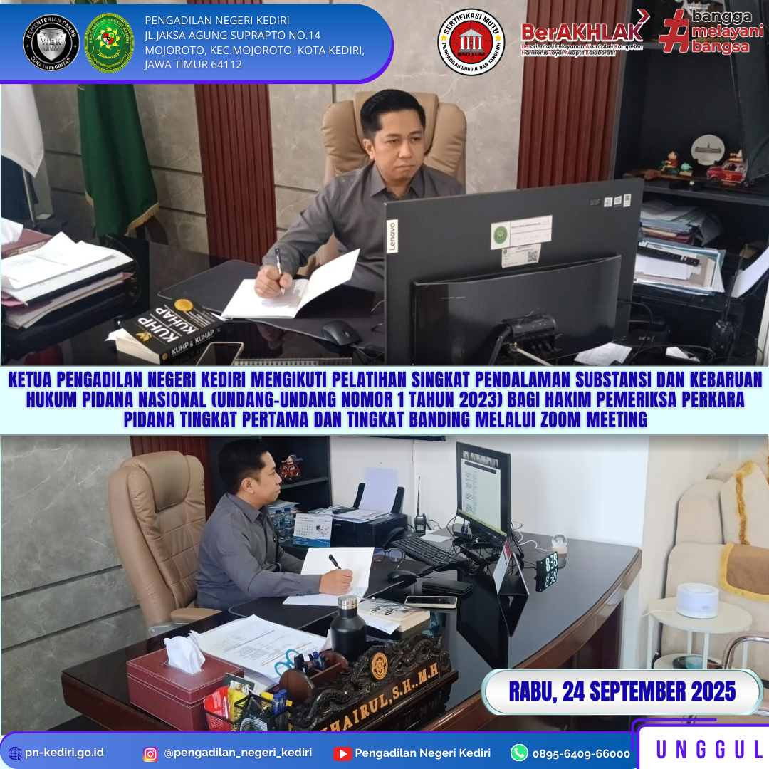 Read MoreKediri, 24 September 2025 Ketua Pengadilan Negeri Kediri, Bapak Khairul, S.H., M.H. mengikuti Pelatihan Singkat Pendalaman Substansi Dan Kebaruan Hukum Pidana Nasional (Undang-Undang Nomor 1 Tahun 2023) Bagi Hakim Pemeriksa Perkara Pidana Tingkat Pertama Dan Tingkat Banding melalui Zoom Meeting pada Hari Rabu, tanggal 24 September 2025. @humasmahkamahagung @ditjenbadilum @kemenpanrb @rbkunwas pnkediriprima #humasmahkamahagung #ditjenbadilum #kemenpanrb #rbkunwas…
