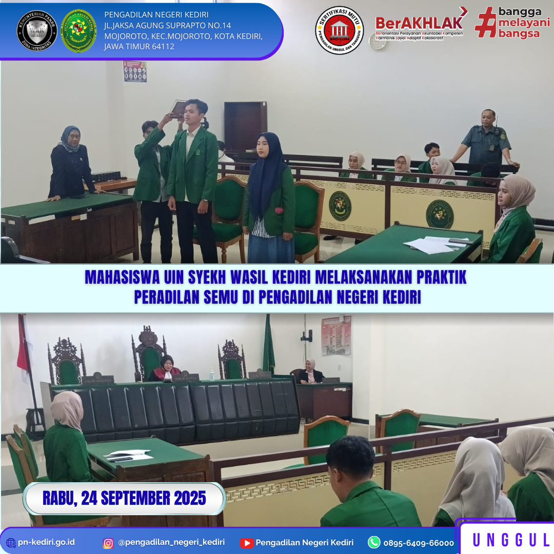 Read MoreRabu, 24 September 2025 Hari Rabu, tanggal 24 September 2025 Mahasiswa Magang Pengadilan Negeri Kediri dari Universitas Islam Negeri Syekh Wasil Kediri melaksanakan simulasi Persidangan Semu di Pengadilan Negeri Kediri dengan didampingi oleh Hakim Pendamping Mahasiswa Magang Pengadilan Negeri Kediri ibu Novi Nuradhayanty, S.H., M.H., yang bertempat di Ruang Sidang Tirta Pengadilan Negeri Kediri. Peradilan semu…