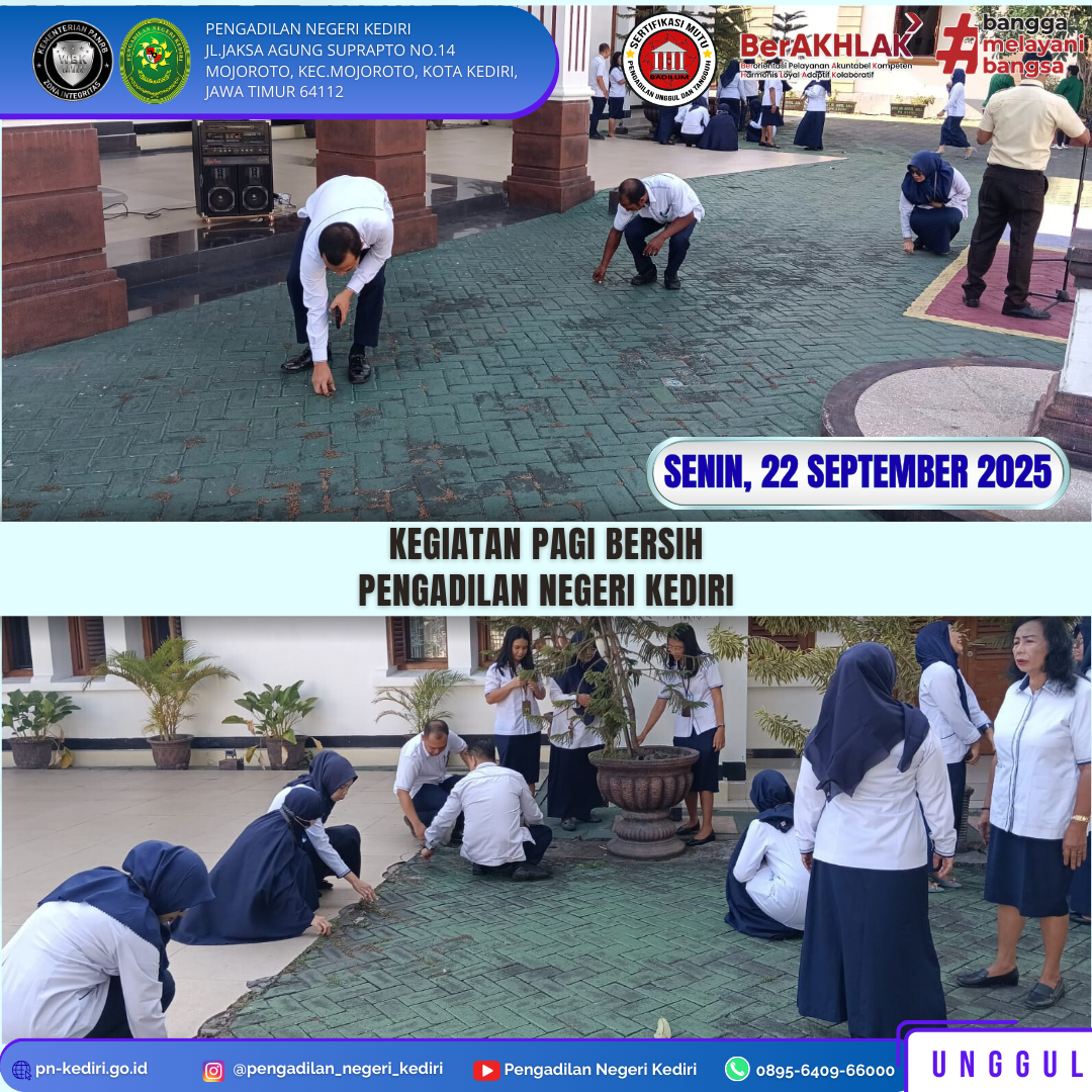 Read MoreKediri, 22 September 2025 Kegiatan Pagi Bersih Pengadilan Negeri Kediri pada Hari Senin, tanggal 22 September 2025. Setelah melaksanakan Apel Pagi, seluruh Keluarga Besar Pengadilan Negeri Kediri melaksanakan kegiatan pagi bersih selama 15 menit dengan membersihkan rumput pada Halaman Pengadilan Negeri Kediri. Kegiatan ini rutin dilakukan setiap Hari Senin pagi untuk menjaga lingkungan kantor agar…