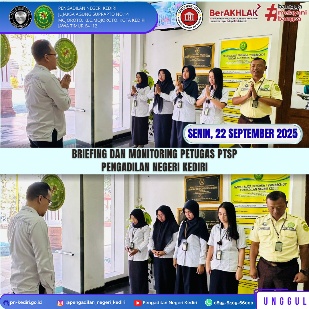 Read MoreKediri, 22 September 2025 Bentuk optimalisasi pelayanan, salah satunya adalah dengan kegiatan monitoring tugas dan tanggung jawab bagi petugas pelayanan. Khusus di layanan PTSP PN Kediri, sebelum pelaksanaan layanan maka setiap pagi dilakukan briefing dan monitoring petugas layanan. Pagi hari ini briefing dipimpin oleh Panitera Muda Perdata dan diikuti oleh seluruh Petugas layanan PTSP pada…