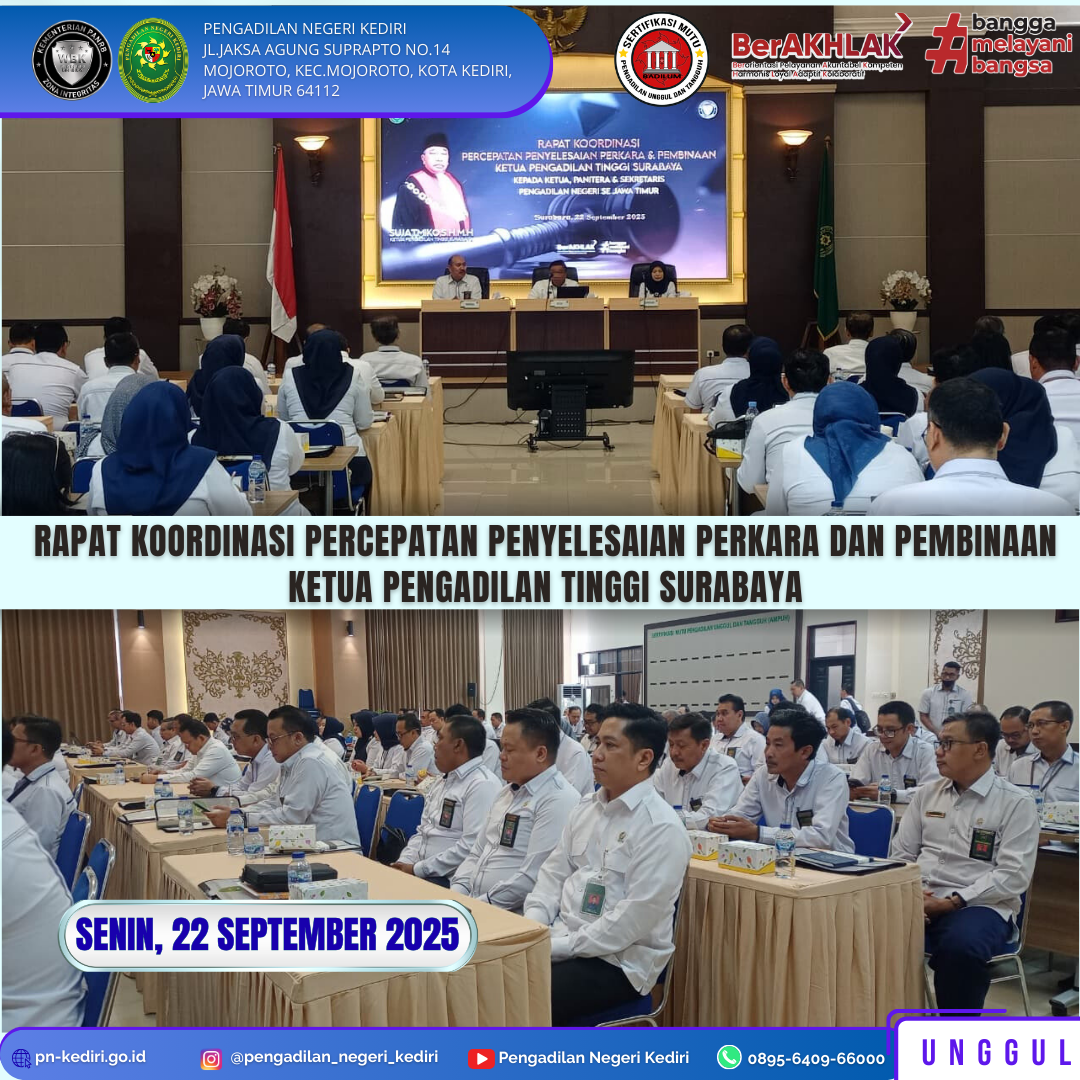 Read MoreSurabaya, 22 September 2025 Ketua Pengadilan Negeri Kediri, Bapak Khairul, S.H., M.H., Panitera, Bapak Berly, S.E., S.H. dan Sekretaris, Ibu Diana Setyawati, S.E., M.M. mengikuti rapat Koordinasi Percepatan Penyelesaian Perkara dan Pembinaan oleh Bapak Ketua Pengadilan Tinggi Surabaya pada Hari Senin, tanggal 22 September 2025, bertempat di Pengadilan Tinggi Surabaya. @humasmahkamahagung@ditjenbadilum@kemenpanrb@rbkunwas #pnkediriprima#humasmahkamahagung#ditjenbadilum#kemenpanrb#rbkunwas Views: 3