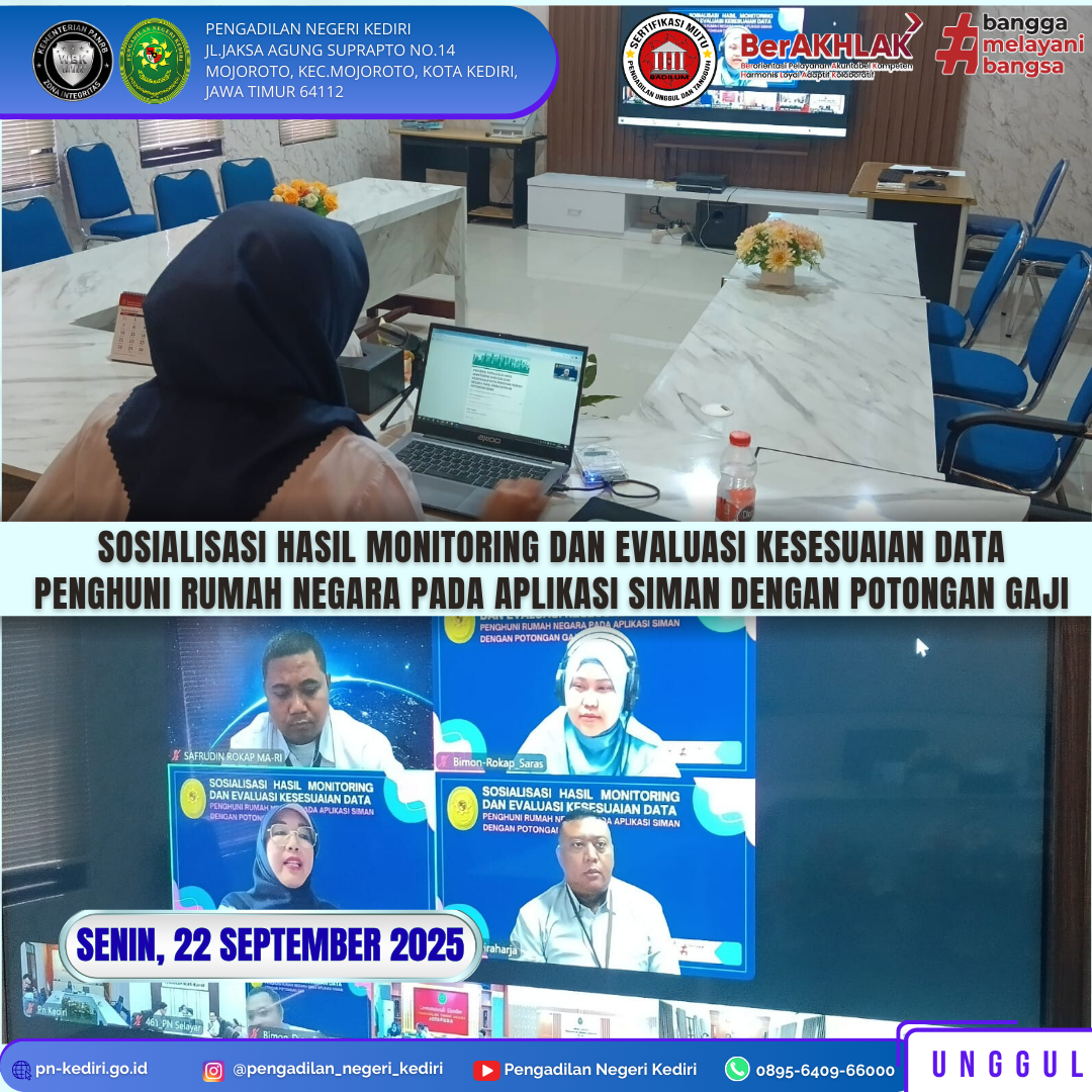 Read MoreKediri, 22 September 2025 Kepala Sub Bagian Umum dan Keuangan Pengadilan Negeri Kediri, Rina Ariani Rahayu, S.E. mengikuti Sosialisasi Hasil Monitoring dan Evaluasi Kesesuaian Data Penghuni Rumah Negara pada Aplikasi SIMAN dengan Potongan Gaji secara daring, pada Hari Senin, tanggal 22 September 2025, bertempat di Ruang Media Center Pengadilan Negeri Kediri. @humasmahkamahagung@ditjenbadilum@kemenpanrb@rbkunwas #pnkediriprima#humasmahkamahagung#ditjenbadilum#kemenpanrb#rbkunwas Views: 3