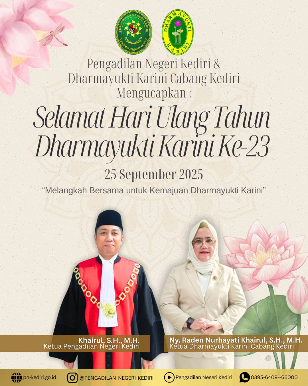 Read MoreKeluarga Besar Pengadilan Negeri Kedirimengucapkan SELAMAT HARI ULANG TAHUNDHARMAYUKTI KARINI KE-23 25 SEPTEMBER 2025 “Melangkah Bersama untuk Kemajuan Dharmayukti Karini” @humasmahkamahagung@ditjenbadilum@kemenpanrb@rbkunwas #pnkediriprima#humasmahkamahagung#ditjenbadilum#kemenpanrb#rbkunwas Views: 14