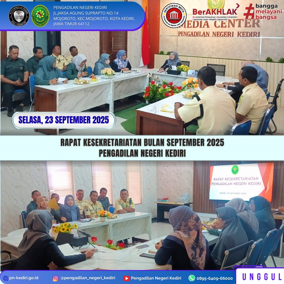 Read MoreKediri, 23 September 2025 Kegiatan Rapat Kesekretariatan pada Hari Selasa, tanggal 23 September 2025, di Ruang Media Center Pengadilan Negeri Kediri.Rapat dipimpin oleh Sekretaris Pengadilan Negeri Kediri, Ibu Diana Setyawati, S.E., M.M. dan dihadiri oleh seluruh Kepala Sub Bagian, Staf Kesekretariatan dan seluruh PPPK pada Pengadilan Negeri Kediri. Ibu Sekretaris menyampaikan untuk senantiasa bekerjasama dalam…