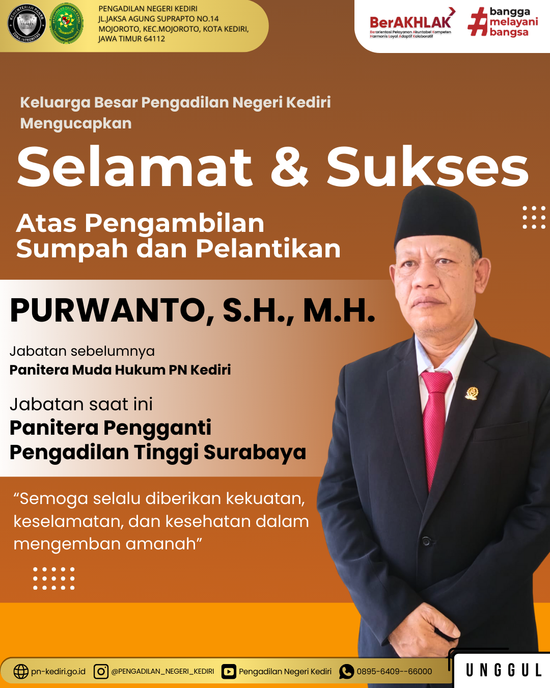 Read MoreKeluarga Besar Pengadilan Negeri Kediri Mengucapkan : Selamat & Sukses Atas Pengambilan Sumpah dan Pelantikan Bapak Purwanto, S.H., M.H. Jabatan SebelumnyaPanitera Muda Hukum Pengadilan Negeri KediriMenjadiPanitera Pengganti Pengadilan Tinggi Surabaya. “Semoga selalu diberikan kekuatan, keselamatan, dan kesehatan dalam mengembann amanah” @humasmahkamahagung@ditjenbadilum@kemenpanrb@rbkunwas #pnkediriprima#humasmahkamahagung#ditjenbadilum#kemenpanrb#rbkunwas Views: 24