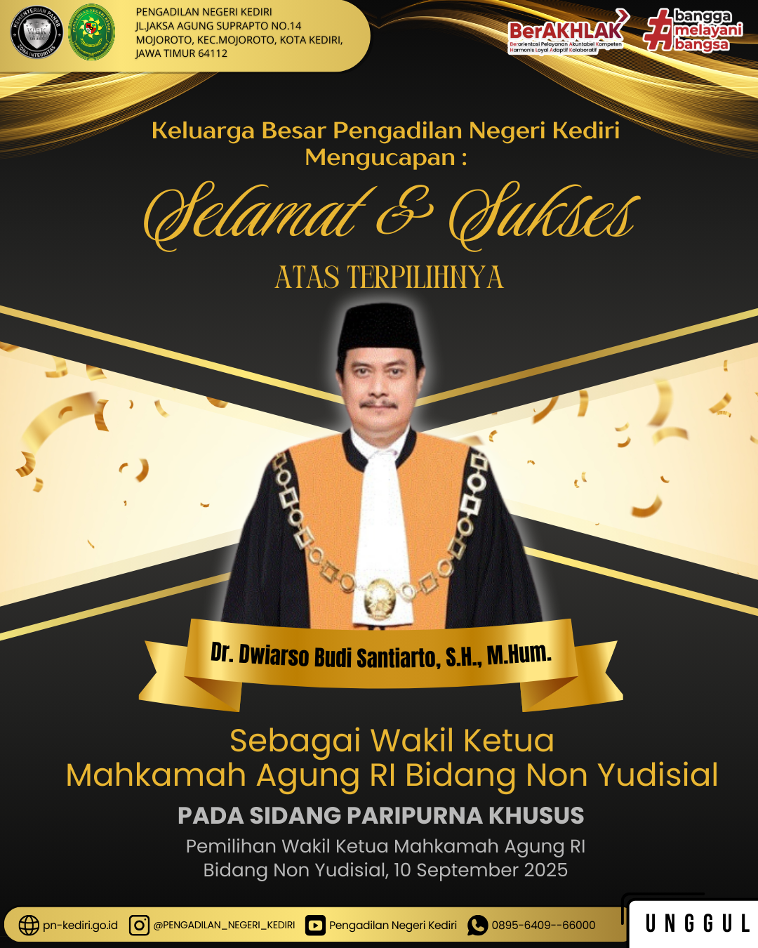 Read MoreKeluarga Besar Pengadilan Negeri KediriMengucapkan: SELAMAT & SUKSES ATAS TERPILIHNYA YM. Dr. Dwiarso Budi Santiarto, S.H., M.Hum. Sebagai Wakil Ketua Mahkamah Agung RI Bidang Non Yudisial Pada Sidang Paripurna Khusus Pemilihan Wakil Ketua Mahkamah Agung RI Bidang Non Yudisial @humasmahkamahagung@ditjenbadilum@kemenpanrb@rbkunwas #pnkediriprima#humasmahkamahagung#ditjenbadilum#kemenpanrb#rbkunwas Views: 4