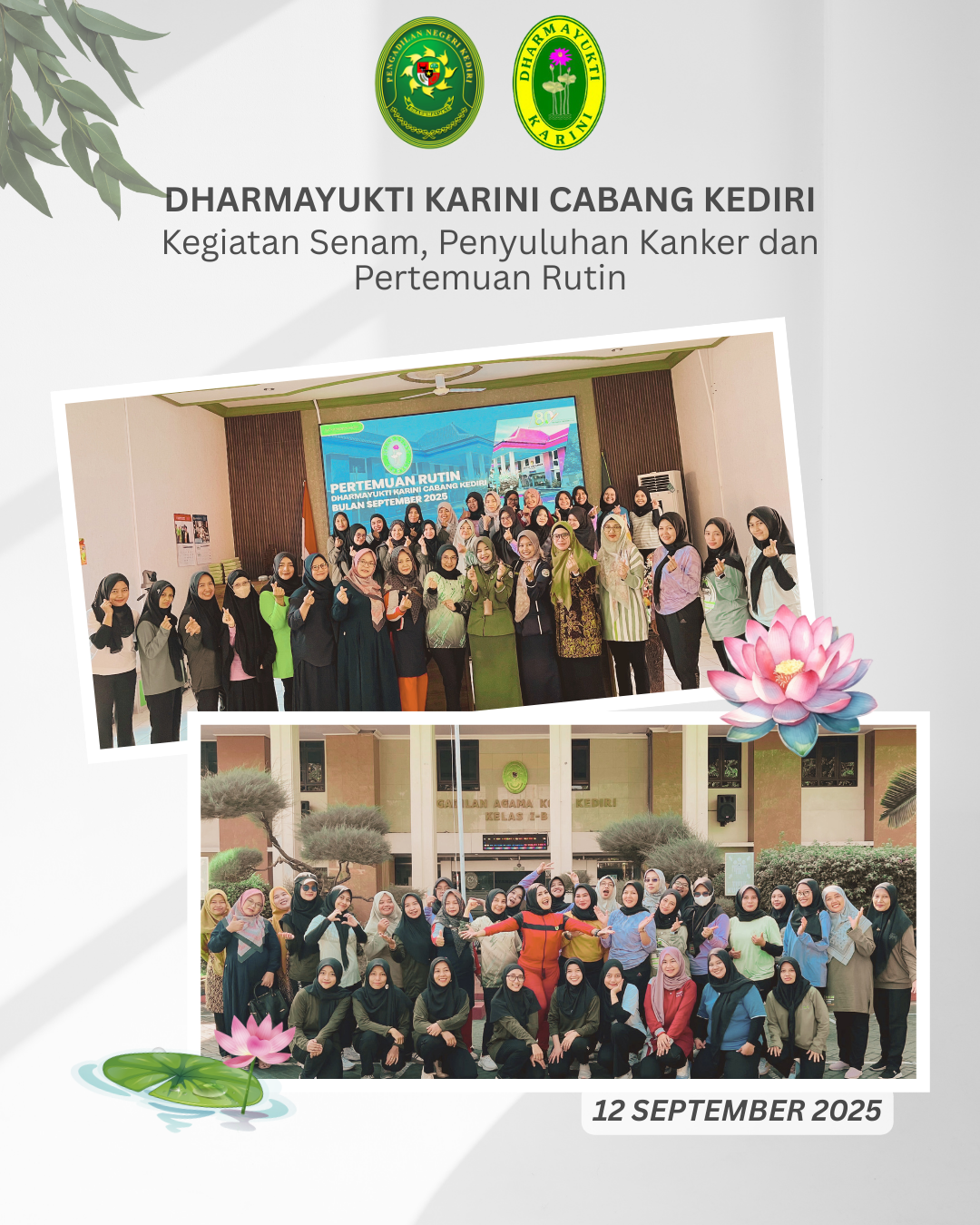 Read MoreKediri, 12 September 2025 Dharmayukti Karini Cabang Kediri melaksanakan kegiatan Senam, Penyuluhan Kanker dan Pertemuan Rutin pada Hari Jum’at, tanggal 12 September 2025, bertempat di Pengadilan Agama Kota Kediri. Kegiatan ini dihadiri oleh seluruh anggota dan pengurus Dharmayukti Karini Pengadilan Negeri Kediri dan Pengadilan Agama Kota Kediri.Kegiatan diawali dengan senam pagi di halaman kantor Pengadilan…