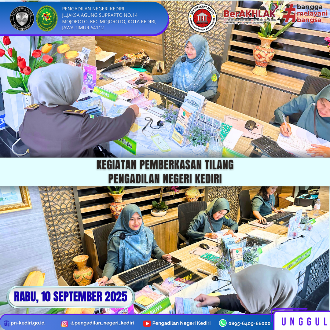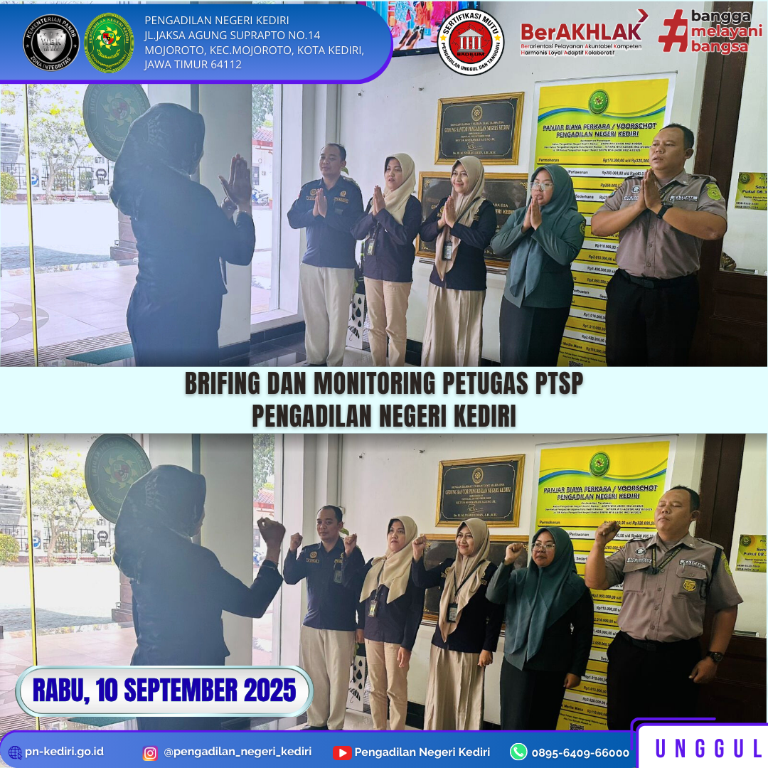 Read MoreKediri, 10 September 2025 Brifing dan monitoring petugas PTSP pada Pengadilan Negeri Kediri.Dipimpin oleh Panitera Muda Perdata, diikuti oleh seluruh Petugas PTSP pada Pengadilan Negeri Kediri. @humasmahkamahagung@ditjenbadilum@kemenpanrb@rbkunwas #pnkediriprima#humasmahkamahagung#ditjenbadilum#kemenpanrb#rbkunwas Views: 26