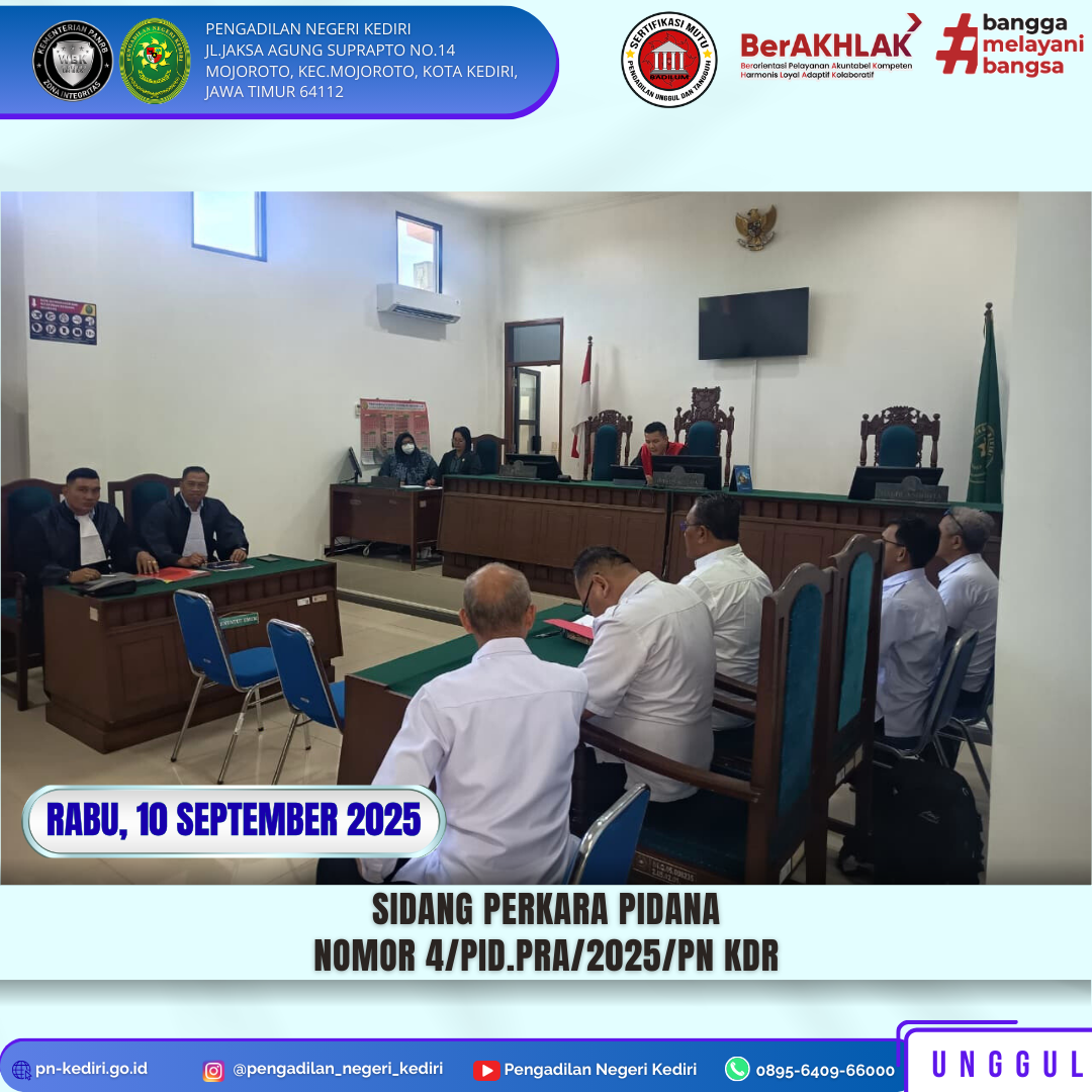 Read MoreKediri, 10 September 2025 Pada hari Rabu, tanggal 10 September 2025 di Ruang Sidang Candra Pengadilan Negeri Kediri. Hakim Tunggal menyidangkan Perkara pra peradilan Nomor 4/Pid.Pra/2025/PN Kdr. Agendanya Pembuktian Pihak Pemohon danAgenda Selanjutnya dengan Pembuktian Pihak Termohon Perkara ini disidangkan dengan Hakim Damar Kusuma Wardana, S.H, M.H. Hakim Tunggal dengan dibantu Panitera Pengganti Mirayati Botto,…
