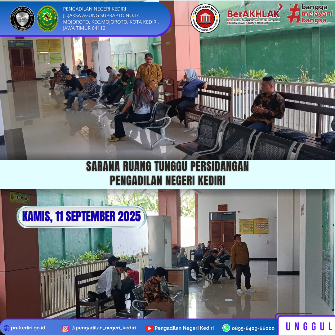Read MoreKamis, tanggal 11 September 2025, di gedung Pengadilan Negeri Kediri khususnya di ruang tunggu persidangan, Nampak beberapa orang sedang menunggu antrian sidang. Ruang tunggu persidangan yang layak merupakan salah satu wujud dari misi Pengadilan yaitu memberikan pelayanan hukum yang berkeadilan. Masyarakat dapat menggunakan ruang tunggu tersebut sesuai kebutuhannya dan di Pengadilan Negeri Kediri di sekitar…