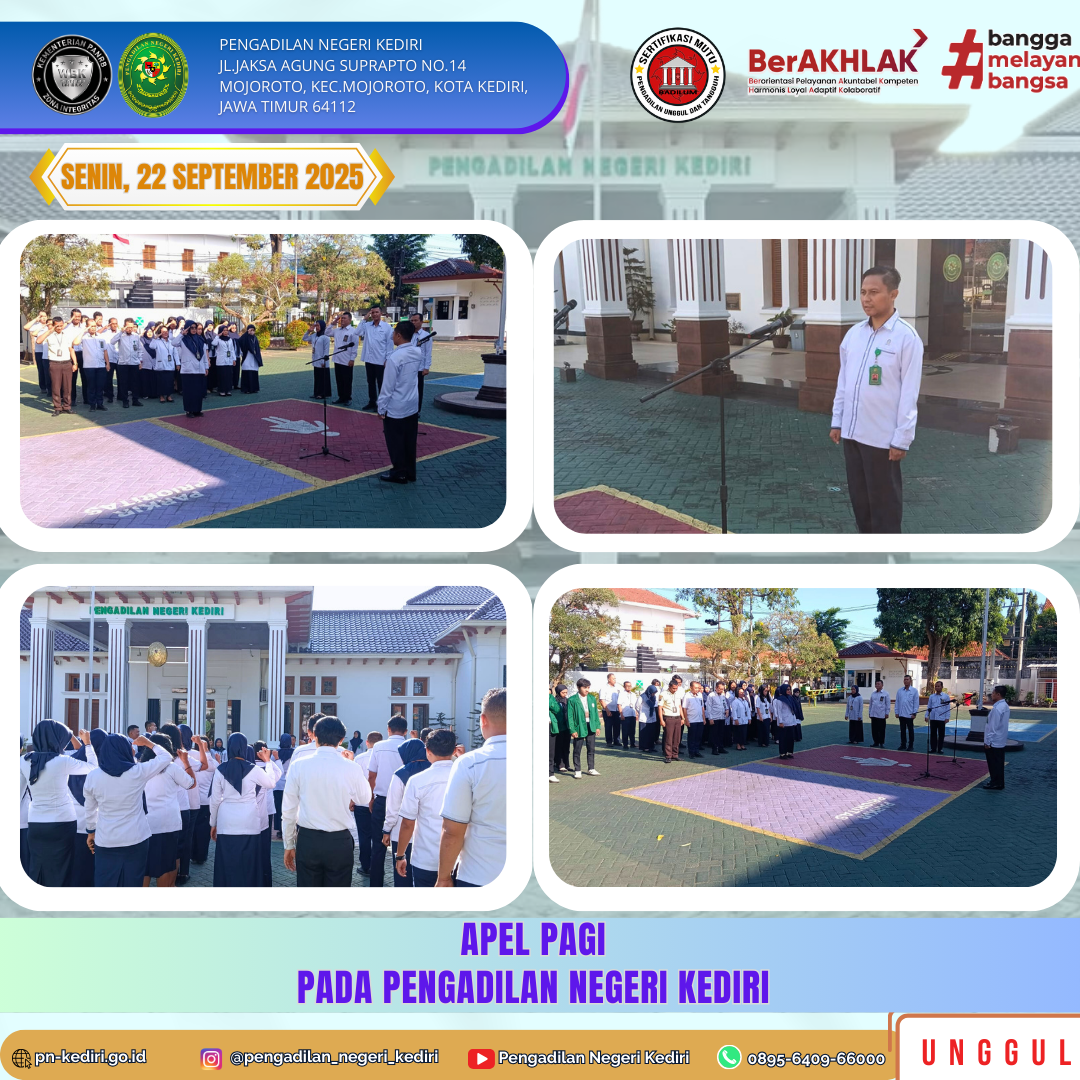 Kegiatan Apel Pagi pada hari Senin, tanggal 22 September 2025 : Pembina : Bapak Alfan Firdauzi Kurniawan, S.H. M.H. Pemimpin : Ibu Rina Ariani Rahayu, S.E. Pembaca 7 Nilai Utama Mahkamah Agung RI dah yel yel : Ibu Amilatus Sa’diyah, S.H. Petugas MC : Ibu Endah Yulia Kusumawati, S.E. @humasmahkamahagung@ditjenbadilum@kemenpanrb@rbkunwas #pnkediriprima#humasmahkamahagung#ditjenbadilum#kemenpanrb#rbkunwas Views: 5