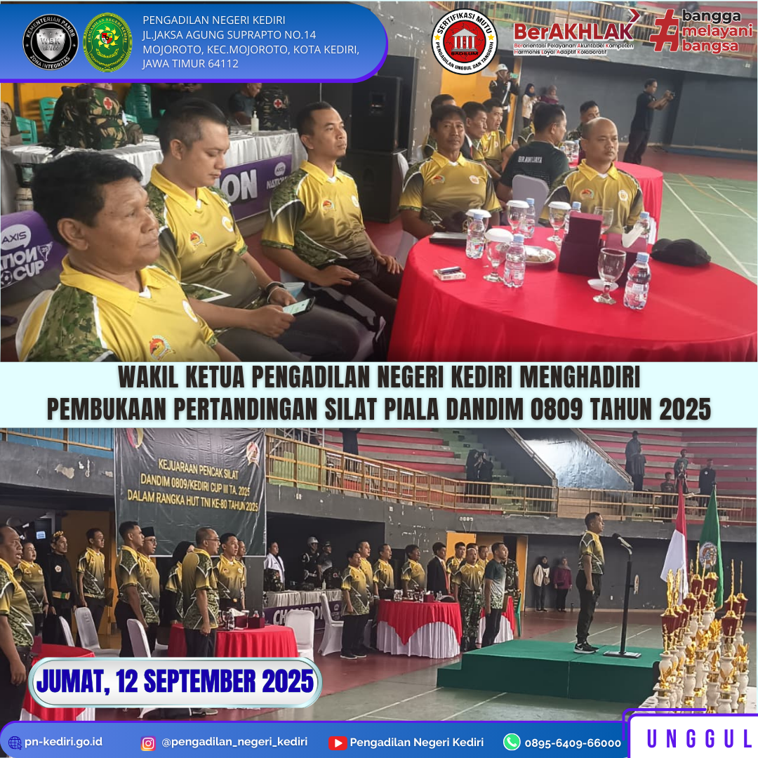 Read MoreKediri, 12 September 2025 Wakil Ketua Pengadilan Negeri Kediri, Bapak Bayu Agung Kurniawan, S.H. menghadiri Pembukaan Pertandingan Silat Piala Dandim 0809 Tahun 2025 di Wilayah Kodim 0809 Rem 082/CPYJ, pada Hari Jum’at, tanggal 12 September 2025, bertempat di Gor Joyoboyo Kota Kediri. @humasmahkamahagung@ditjenbadilum@kemenpanrb@rbkunwas #pnkediriprima#humasmahkamahagung#ditjenbadilum#kemenpanrb#rbkunwas Views: 4