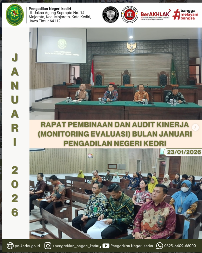 Read MoreKediri, 23 Januari 2026 Pengadilan Negeri Kediri telah melaksanakan Rapat Pembinaan dan Audit Kinerja (Monitoring dan Evaluasi) Bulan Januari Tahun 2026 yang bertempat di Ruang Sidang Cakra Pengadilan Negeri Kediri. Rapat tersebut dipimpin oleh Ketua Pengadilan Negeri Kediri, Bapak Khairul, S.H., M.H., bersama dengan Wakil Ketua Pengadilan Negeri Kediri, Bapak Bayu Agung Kurniawan, S.H., serta…
