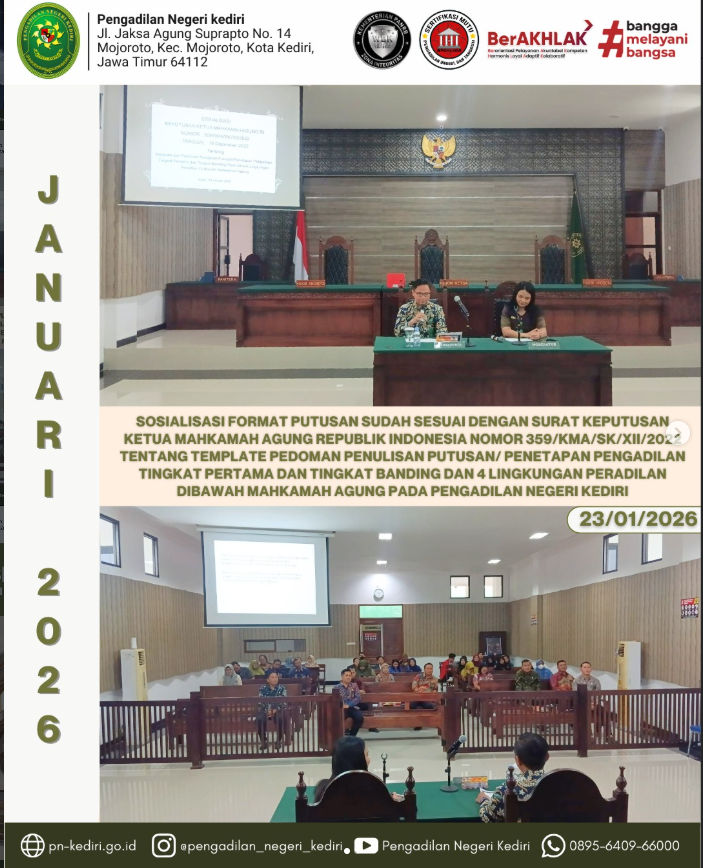 Read MoreKediri, 23 Januari 2026 Pengadilan Negeri Kediri telah melaksanakan kegiatan sosialisasi terkait format penulisan putusan dan penetapan yang disesuaikan dengan ketentuan Surat Keputusan Ketua Mahkamah Agung Republik Indonesia Nomor 359/KMA/SK/XII/2022 tentang Template Pedoman Penulisan Putusan/Penetapan Pengadilan Tingkat Pertama dan Tingkat Banding pada Empat Lingkungan Peradilan di Bawah Mahkamah Agung. Kegiatan sosialisasi tersebut menghadirkan Hakim Pengadilan…