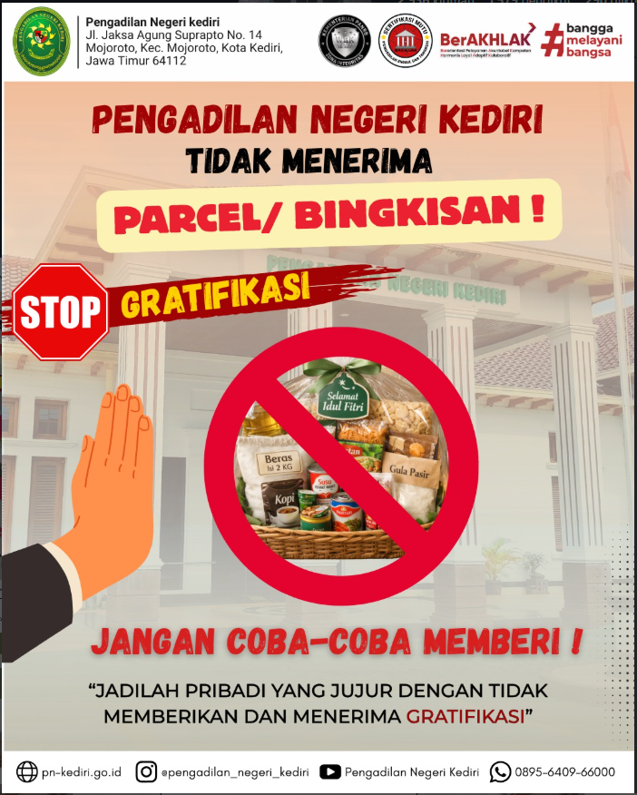 Read MorePengadilan negeri kediriTidak MenerimaParcel/ Bingkisan ! Jangan Coba-Coba Memberi ! “Jadilah pribadi yang jujur dengan tidak memberikan dan menerima Gratifikasi” @humasmahkamahagung@ditjenbadilum@kemenpanrb@rbkunwas #pnkediriprima#humasmahkamahagung#ditjenbadilum#kemenpanrb#rbkunwas Views: 5