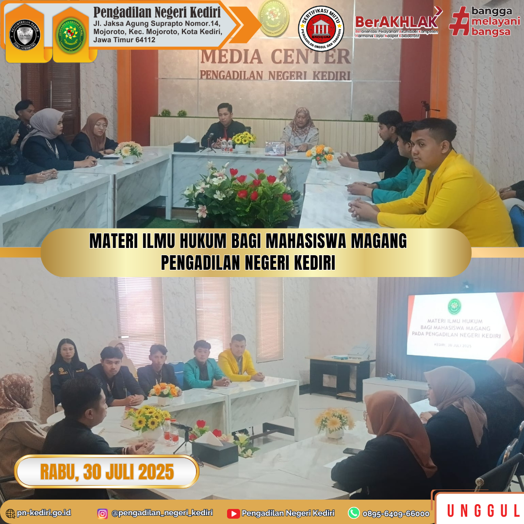 Kediri, 30 Juli 2025 Bapak Khairul, S.H., M.H., Ketua Pengadilan Negeri Kediri memberikan materi Ilmu Hukum bagi Mahasiswa Magang di Pengadilan Negeri Kediri pada Hari Rabu, tanggal 30 Juli 2025, bertempat di Ruang Media Center Pengadilan Negeri Kediri. Pada kegiatan ini Bapak Khairul, S.H., M.H. memberikan materi tentang Hukum Acara Pidana dan jenis Putusan Hakim…