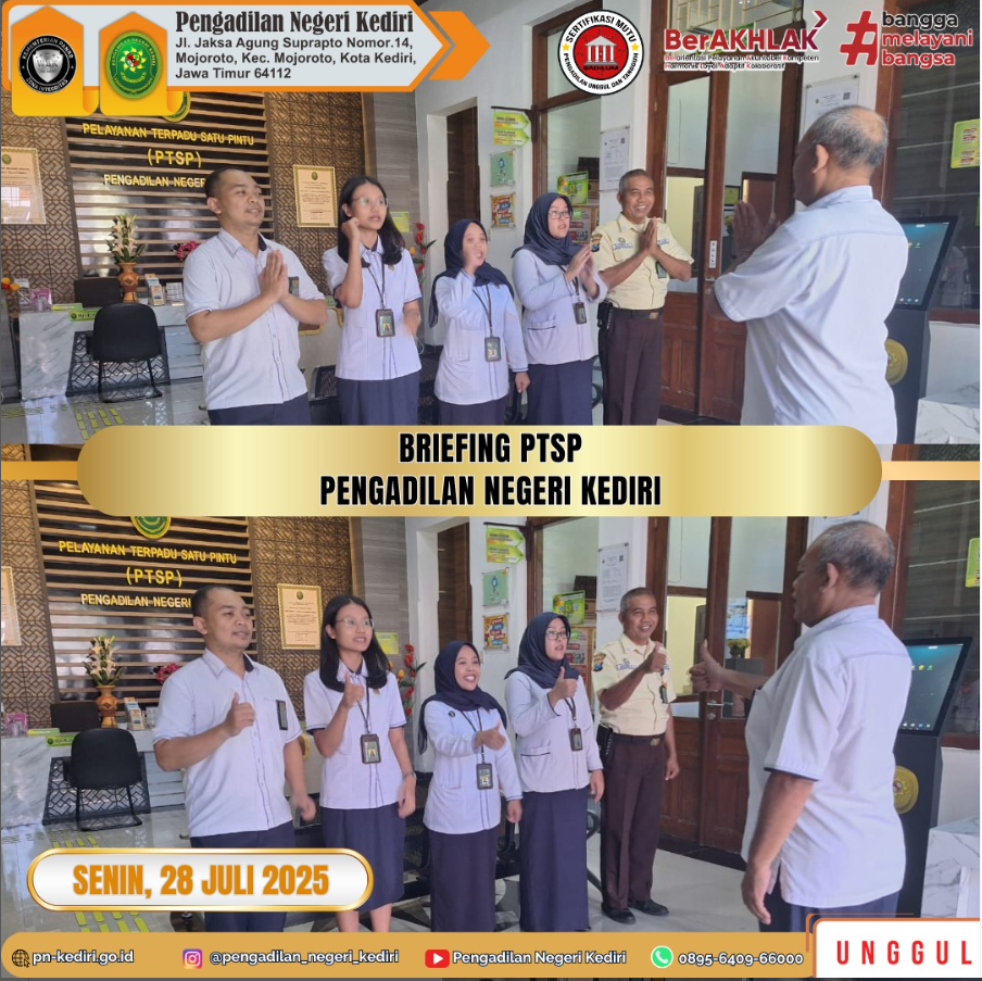 Read MoreKediri, 28 Juli 2025 Briefing PTSP pada Pengadilan Negeri Kediri.Dipimpin oleh Panitera Muda Hukum, diikuti oleh seluruh Petugas PTSP pada Pengadilan Negeri Kediri. @humasmahkamahagung@ditjenbadilum@kemenpanrb@rbkunwas #pnkediriprima#humasmahkamahagung#ditjenbadilum#kemenpanrb#rbkunwas Views: 0