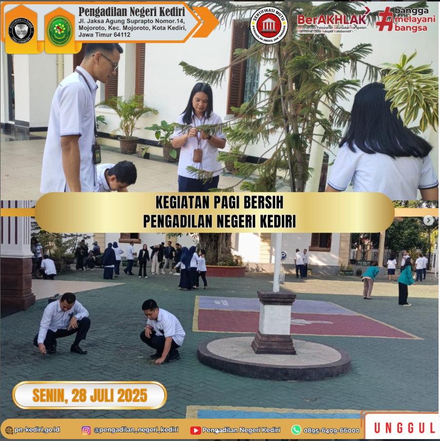 Read MoreKediri, 28 Juli 2025 Kegiatan Pagi Bersih Pengadilan Negeri Kediri pada Hari Senin, tanggal 28 Juli 2025. Setelah melaksanakan Apel Pagi, seluruh Keluarga Besar Pengadilan Negeri Kediri melaksanakan kegiatan pagi bersih selama 15 menit dengan membersihkan rumput pada Halaman Pengadilan Negeri Kediri. Kegiatan ini rutin dilakukan setiap Hari Senin pagi untuk menjaga lingkungan kantor agar…