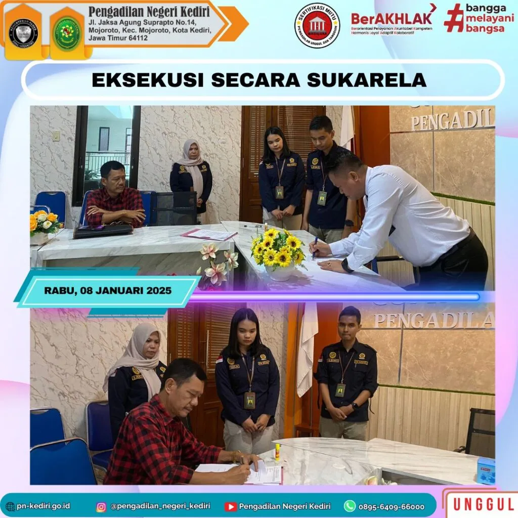 Eksekusi secara sukarela Nomor 8/Pdt.Eks/2023/PN Kdr. Setelah melalui aanmaning dan beberapa kali koordinasi dengan Ketua Pengadilan Negeri Kediri pada Hari Rabu, tanggal 8 Januari 2025, kuasa pemohon eksekusi melaporkan kepada Ketua Pengadilan Negeri Kediri bahwa termohon eksekusi telah melaksanakan eksekusi secara sukarela dengan melakukan pembayaran kepada pemohon eksekusi sehingga pemohon eksekusi menerangkan telah sepakat mengakhiri persengketaan dengan termohon eksekusi di hadapan Ketua Pengadilan Negeri Kediri, Panitera, serta disaksikan oleh saksi-saksi.