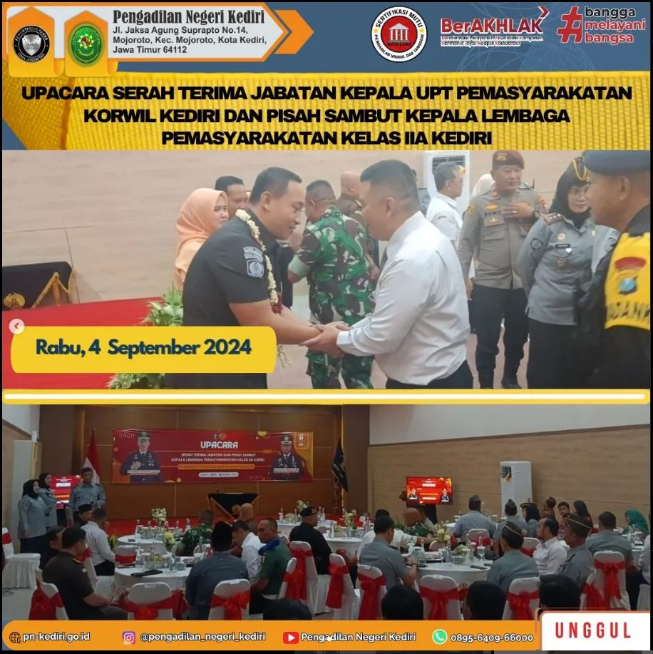 Hakim Pengadilan Negeri Kediri, Bapak Emmy Haryono Saputro, S.H., M.H. mewakili Ketua Pengadilan Negeri Kediri menghadiri Upacara Serah Terima Jabatan Kepala UPT Pemasyarakatan Korwil Kediri dan Pisah Sambut Kepala Lembaga Pemasyarakatan Kelas IIA Kediri, pada Hari Rabu, Tanggal 4 September 2024, di Aula Welas Asih Lembaga Pemasyarakatan Kelas IIA Kediri.