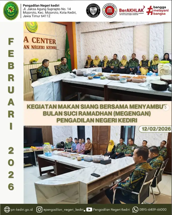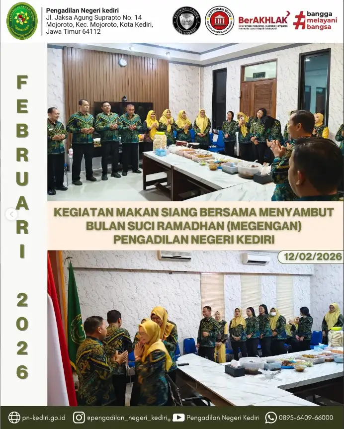 Kegiatan makan siang bersama dalam rangka menyambut Bulan Suci Ramadhan (Megengan) dilaksanakan oleh Pengadilan Negeri Kediri dengan penuh khidmat dan suasana kekeluargaan. Kegiatan tersebut dipimpin oleh Wakil Ketua Pengadilan Negeri Kediri dan diikuti oleh seluruh keluarga besar Pengadilan Negeri Kediri.
