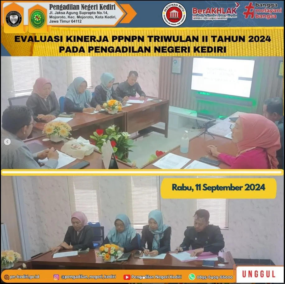 Kegiatan Evaluasi Kinerja Pegawai Pemerintah Non Pegawai Negeri pada Pengadilan Negeri Kediri Triwulan II Tahun Anggaran 2024. Kegiatan Evaluasi ini dilaksanakan pada hari Rabu, tanggal 11 September 2024, bertempat di Ruang Command Center Pengadilan Negeri Kediri, dipimpin oleh Sekretaris Pengadilan Negeri Kediri, Bapak Andi Wilsan, S.T. dan dihadiri oleh seluruh Panitera Muda dan Kepala Sub Bagian Pengadilan Negeri Kediri.