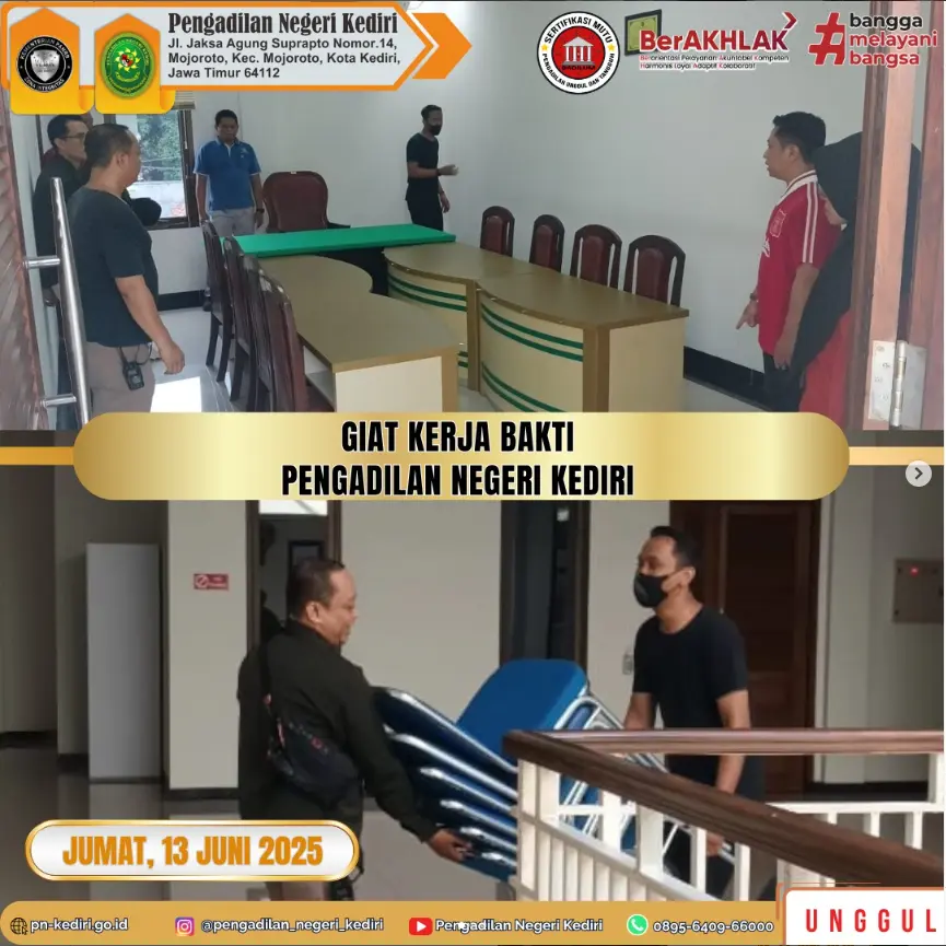 Kegiatan Kerja Bakti Pengadilan Negeri Kediri pada Hari Jum’at, tanggal 13 Juni 2025, bertempat di Dalam kantor Pengadilan Negeri Kediri, diikuti oleh seluruh Keluarga Besar Pengadilan Negeri Kediri.