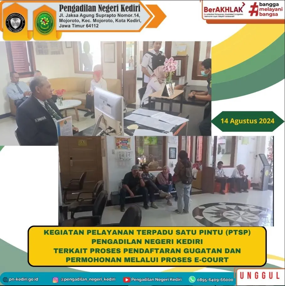 Kegiatan Pelayanan Terpadu Satu Pintu (PTSP) Pengadilan Negeri Kediri terkait proses pendaftaran gugatan dan permohonan melalui proses e-court. Petugas PTSP memberikan penjelasan tentang alur dan mekanisme pendaftaran tersebut sehingga memudahkan para pihak pencari keadilan dalam berproses persidangan dan terwujud asas peradilan yang sederhana, cepat dan biaya yang ringan.