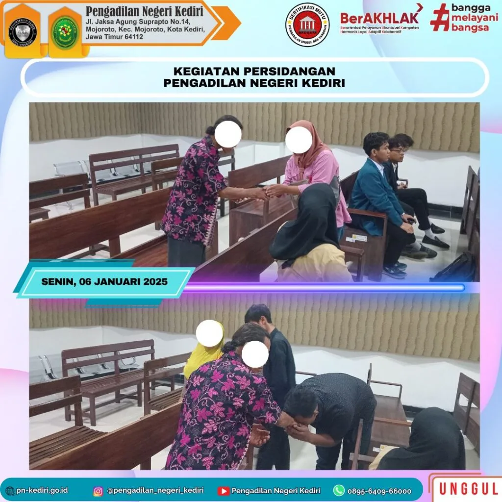 Pada hari Senin, tanggal 06 Januari 2025 di Ruang Sidang Cakra Pengadilan Negeri Kediri. Majelis Hakim Pengadilan Negeri Kediri menyidangkan perkara Pidana Nomor : 203/Pid.Sus/2024/PN Kdr atas nama Terdakwa Dani Uasa Saktiawan Sinaga. Proses persidangan saat ini memasuki tahapan tambahan bukti dari Penuntut Umum. Dimana Terdakwa didakwa dengan ancaman pidana sebagaimana diatur dalam Kesatu pasal 80 ayat (3) Undang-undang Republik Indonesia No. 17 tahun 2016 Tentang Penetapan Peraturan Pemerintahan Pengganti Undang-undang RI No. 1 tahun 2016 Tentang Perubahan Kedua atas Undang-undang Republik Indonesia No. 23 tahun 2002 Tentang Perlindugan Anak dan Kedua Pasal 351 Ayat (1) KUHP. Perkara ini termasuk perkara yang menarik perhatian karena penganiayaan yang menyebabkan korban meninggal dunia. Dalam persidangan ini Anak Saksi dan Orang Tua Terdakwa telah meminta maaf pada orang tua korban. Perkara ini disidangkan dengan susunan Majelis Khairul, S.H., M.H., Agung Kusumo Nugroho, S.H., M.H. dan Emmy Haryono Saputro, S.H., M.H., dibantu Panitera Pengganti Ramini, S.H., M.H.
